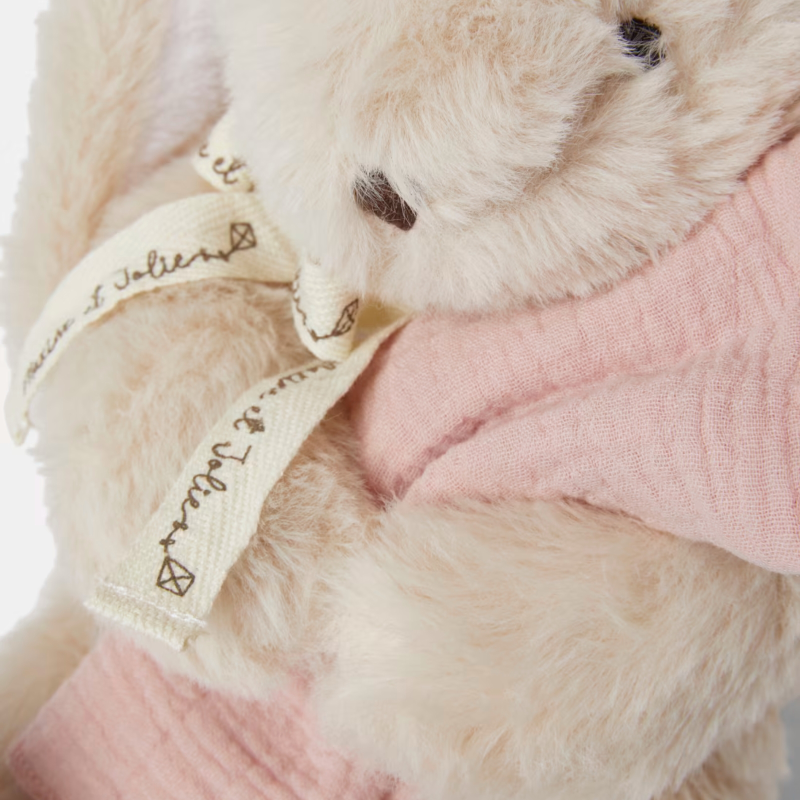 CAMILLE gåvokit består av ett lurvigt gosedjur och en snuttefilt i bomullsmuslin.