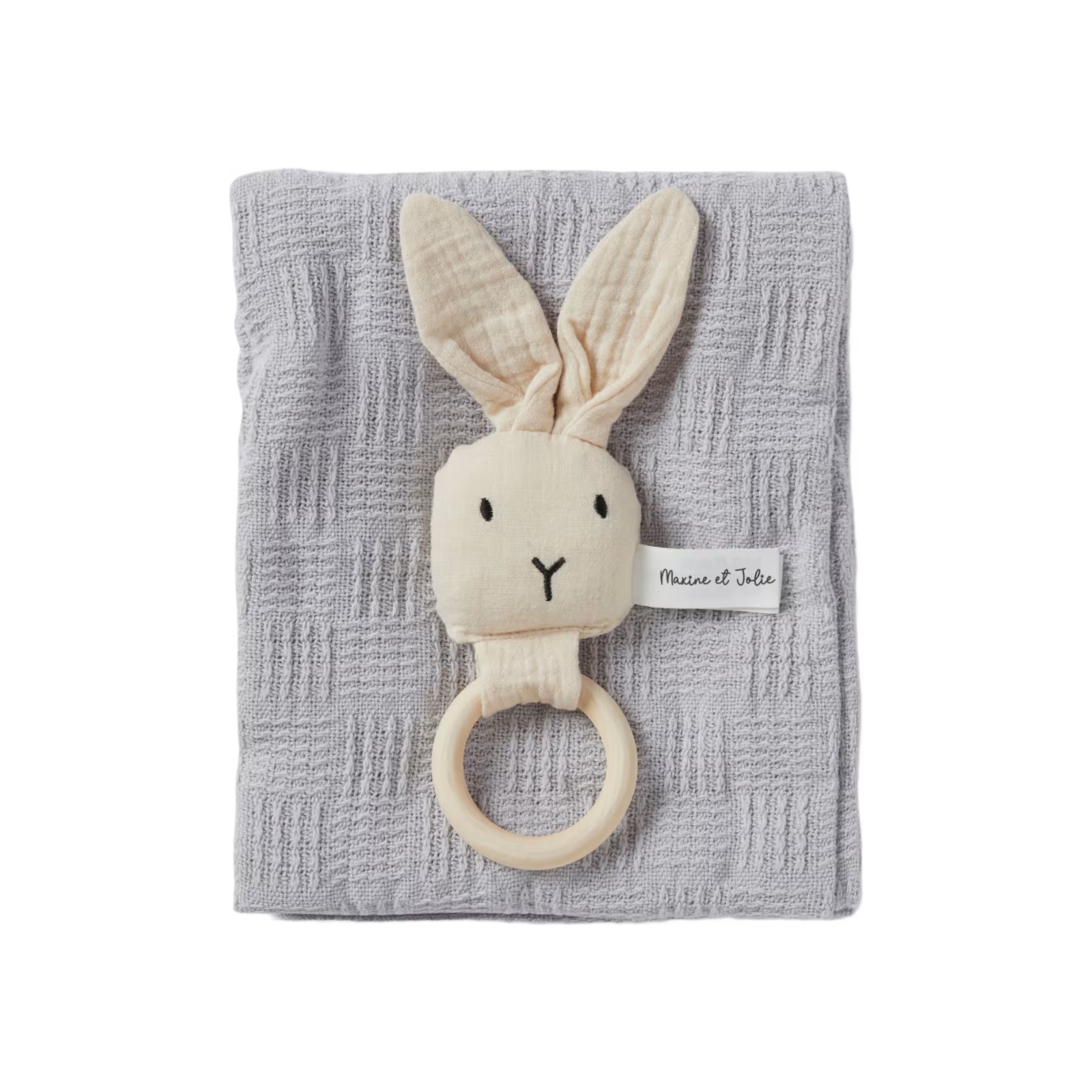 ETIENNE gåvokit består av en kaninskallra och en filt i 100% bomull.
