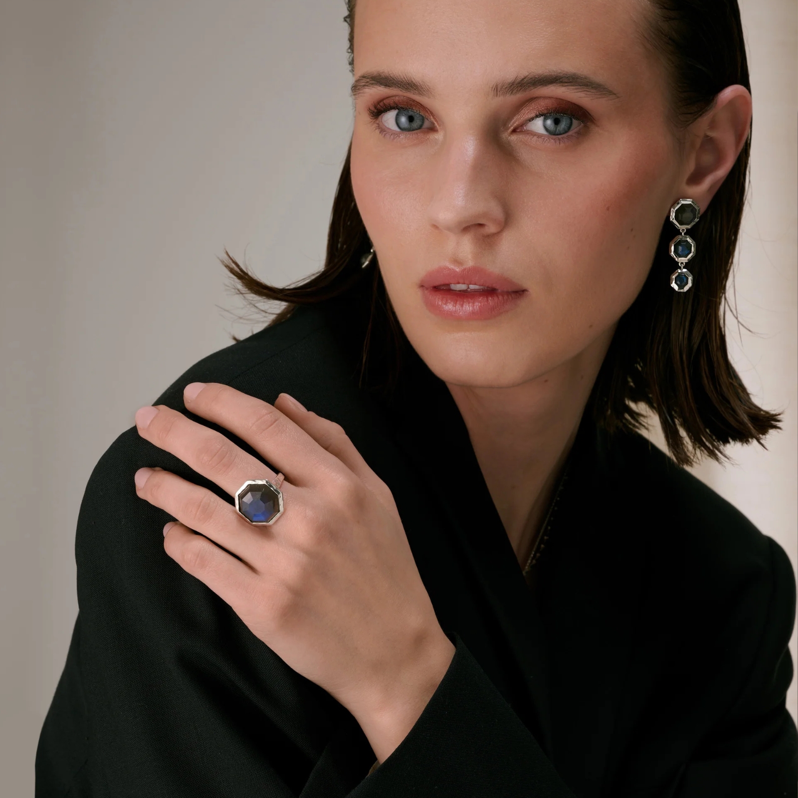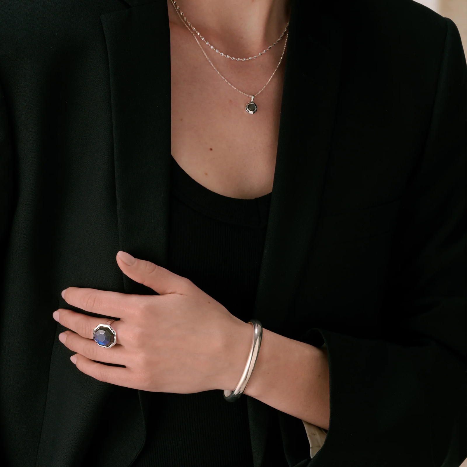 Varje ring är handgjord med omsorg och har en noggrant utvald fasetterad labradorit. Stenen är en naturlig ädelsten, vilket innebär att variationer i färg och utseende förekommer – varje smycke blir helt unikt.Så stylar du den