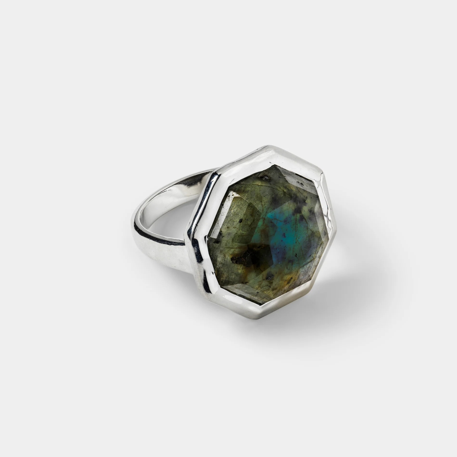 Statement-ring med oktagonformad, infattad fasetterad labradorit. Ringens infattning har en vacker hamrad yta i 925 sterlingsilver, 100% återvunnet. Den stora, fasetterade stenen drar till sig blickar och ger ringen den där wow-känslan. Bär den som ett statement för sig, eller kombinera med andra smycken ur kollektionen.