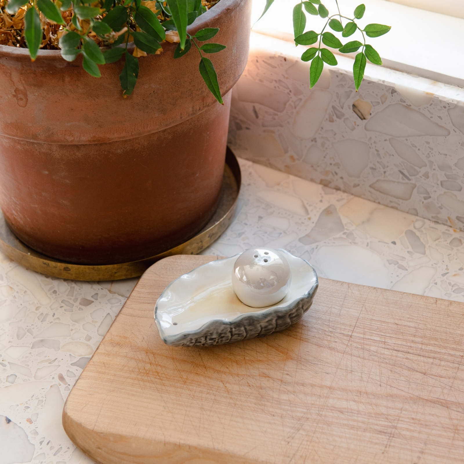 Ge din dukning en touch av havets charm! Det här lekfulla salt- och pepparsetet är inspirerat av ostronet, där skalet och pärlan blir två separata delar. Pärlan används för saltet och lyfts upp ur skalet, som i sin tur används för peppar.