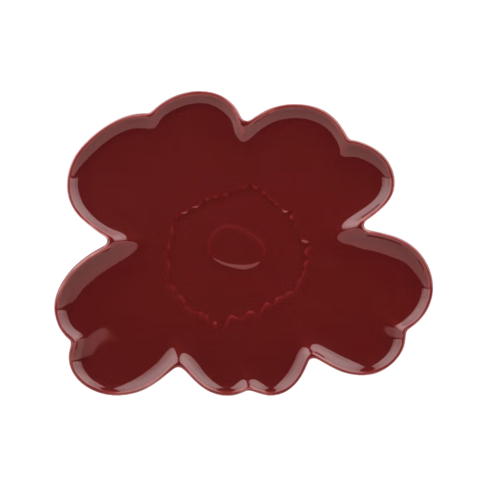 Den stora tallriken i form av Unikko-blomman är tillverkad i keramik med en vinröd glasyr. Den färgade glasyren kan ge produkten ett livfullt uttryck. Vi rekommenderar att tallriken handdiskas. Den kan visserligen diskas i maskin, men det unika designen kan riskera att skadas vid kontakt med andra föremål.