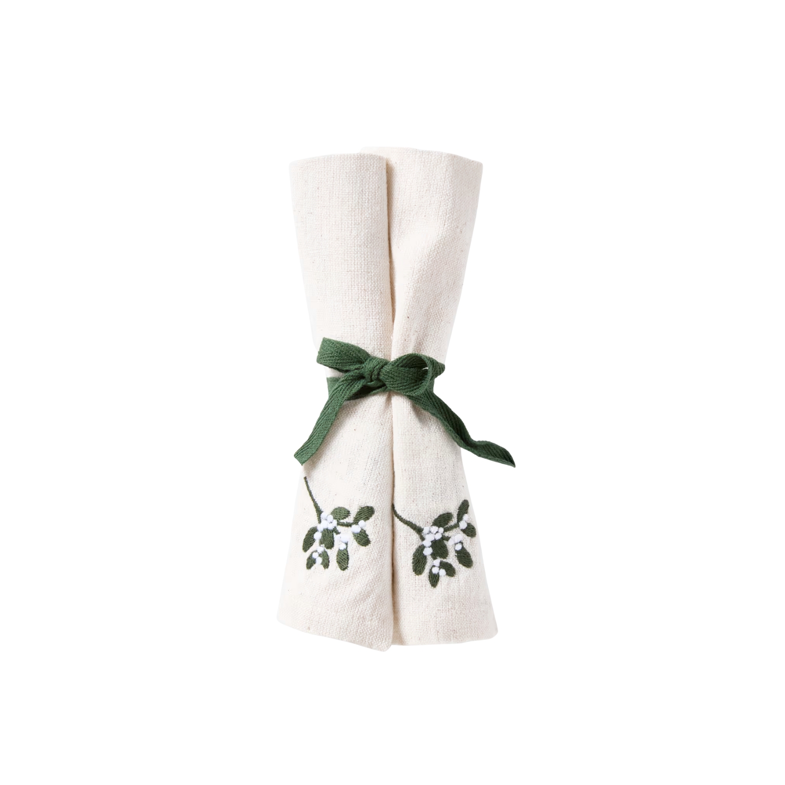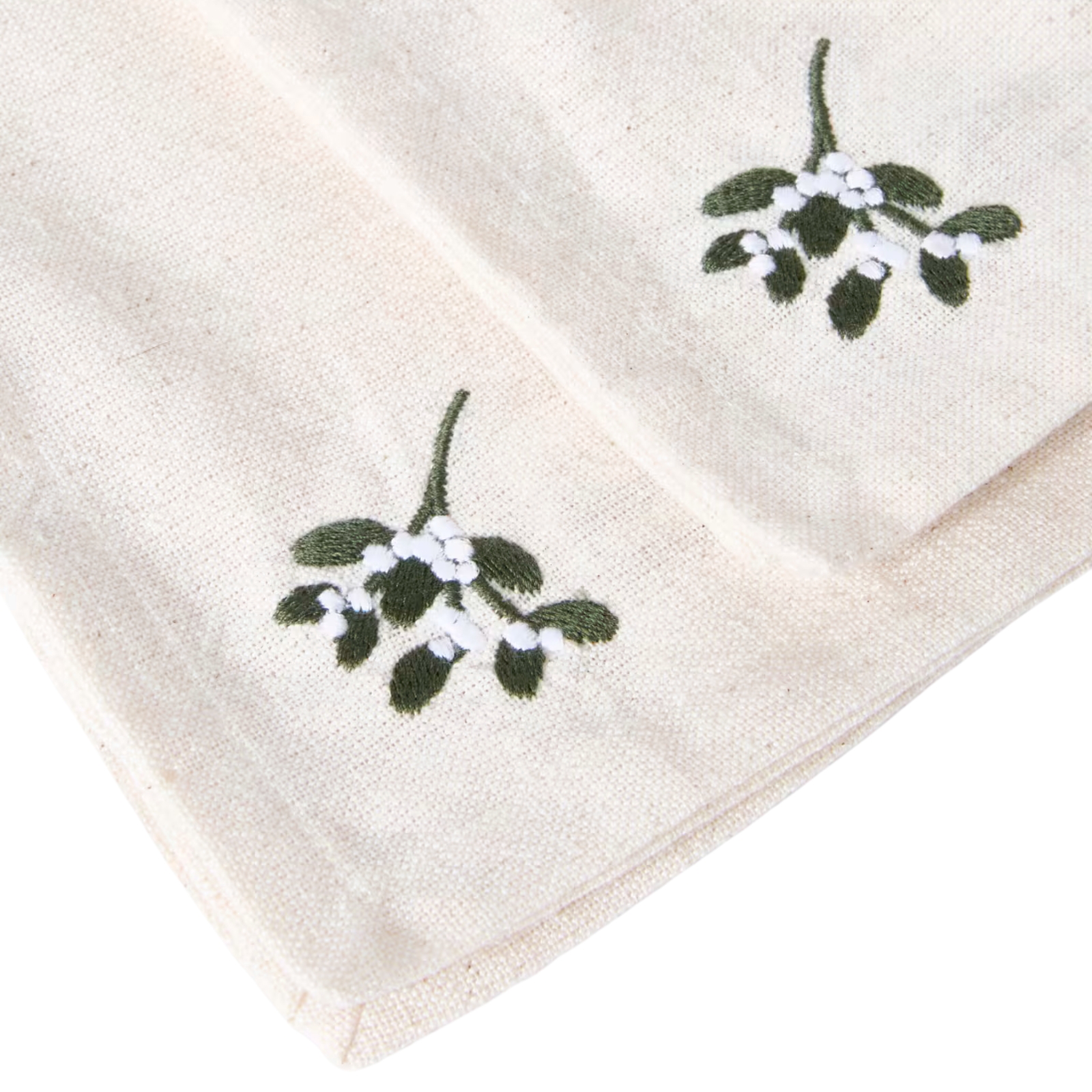 Enfärgade bomullsservetter med en liten broderad mistel i ena hörnet.