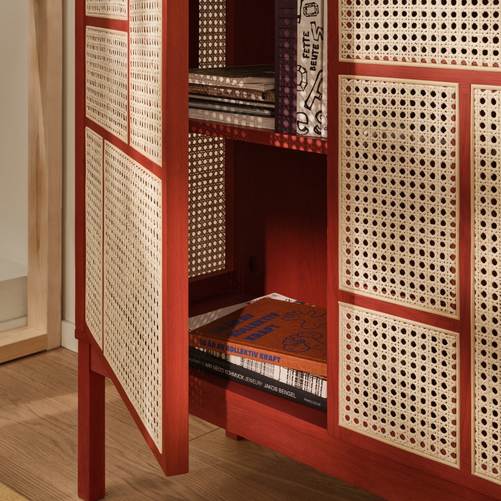 Air Sideboard från Design House Stockholm är en stilren förvaringsmöbel som kombinerar lackerad ekfanér, massiv ek och naturlig rotting för ett uttryck som känns både samtida och retro. Den flätade rottingen skapar ett semi-transparent intryck som ger möbeln lätthet och låter dig ana innehållet bakom luckorna.