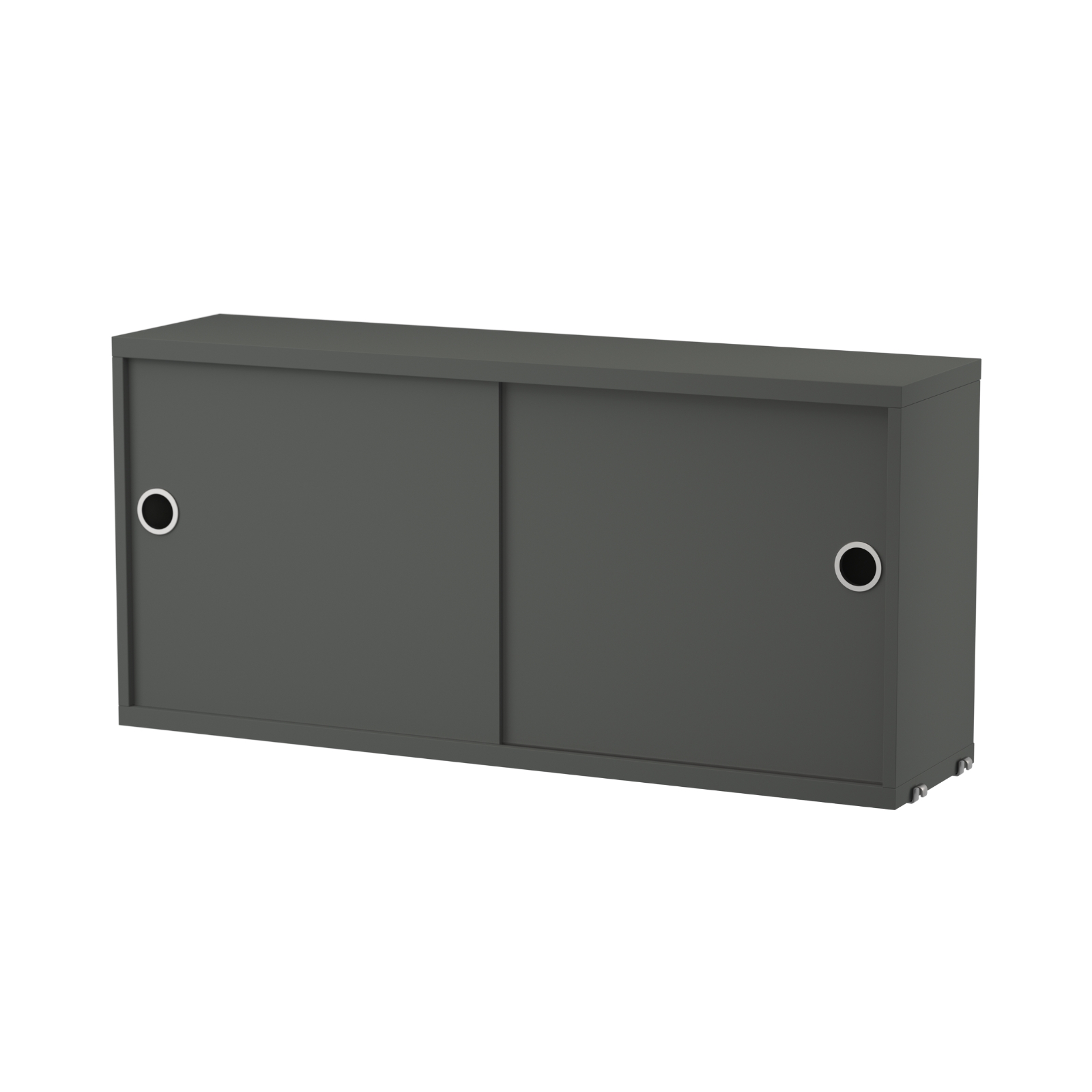 Skåpet med skjutdörrar kan enkelt integreras i String®-hyllsystemet i några få steg. Skåpet finns i en bredd, 78 cm, och två djup, 20 och 30 cm.