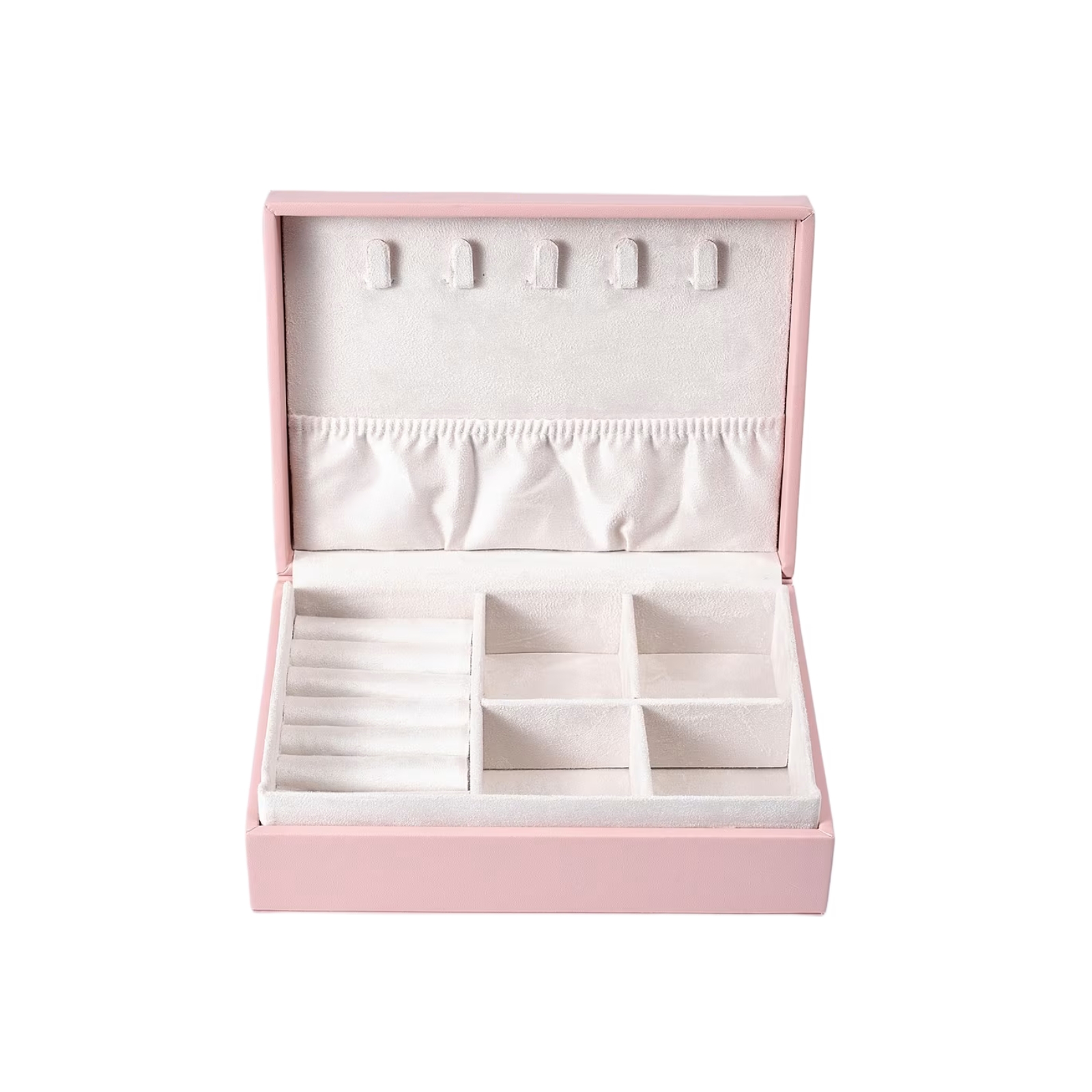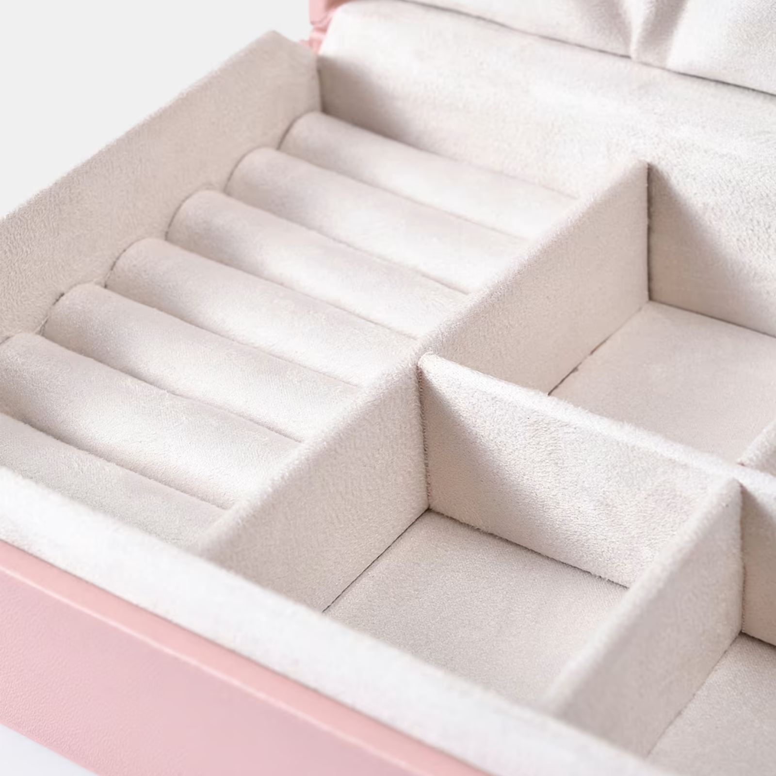 Botten har fyra avskilda utrymmen och en vadderad rad för säker förvaring av ringar och örhängen.