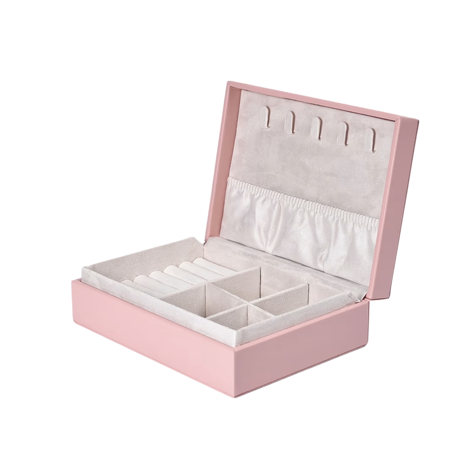 I locket finns fem krokar och en resårförsedd ficka nedtill för att enkelt hålla ordning på halsband.• Smyckeskrin med lock