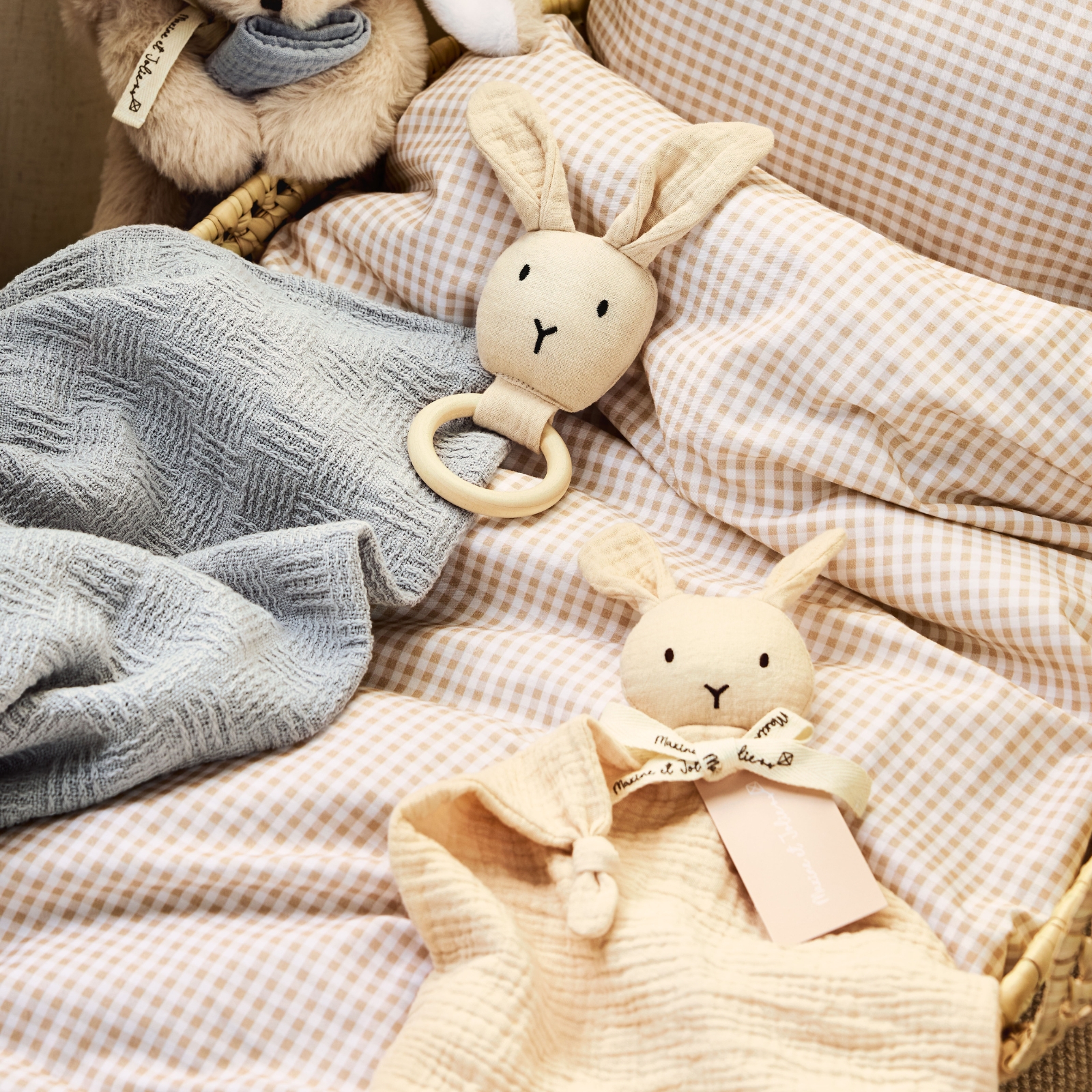 Välj mellan följande djur: katt, kanin, björn eller elefant.• Snuttefilt med gosedjur