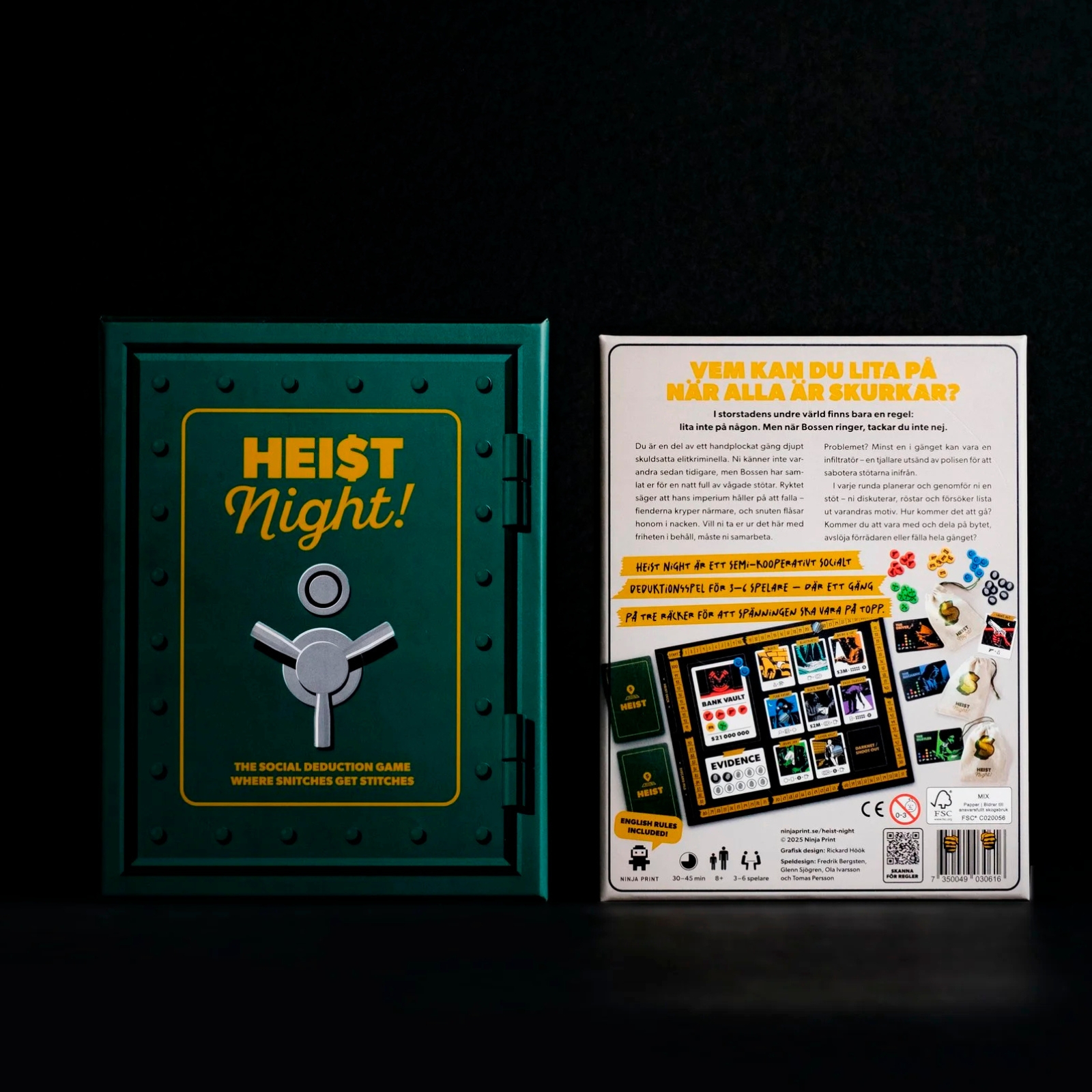 Heist Night är ett semi-kooperativt socialt deduktionsspel för 3–6 spelare där ett gäng på tre räcker för att spänningen ska vara på topp.