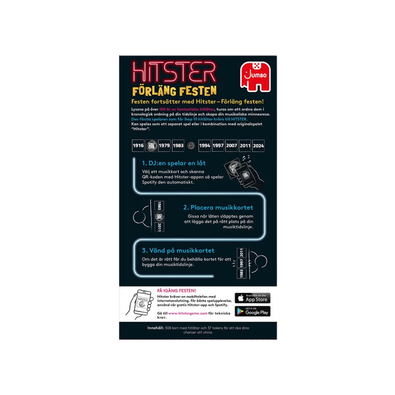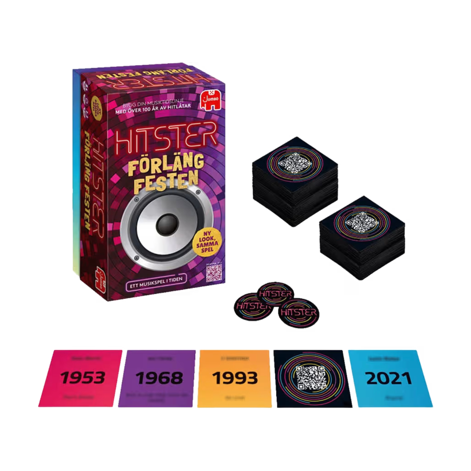 Ta din fest till en helt ny nivå med "Hitster Förläng Festen", en självständig expansion som innehåller 300 extra hits! Denna expansion är unikt konstruerad för att kunna spelas antingen tillsammans med originalspelet Hitster eller som ett fristående spel.