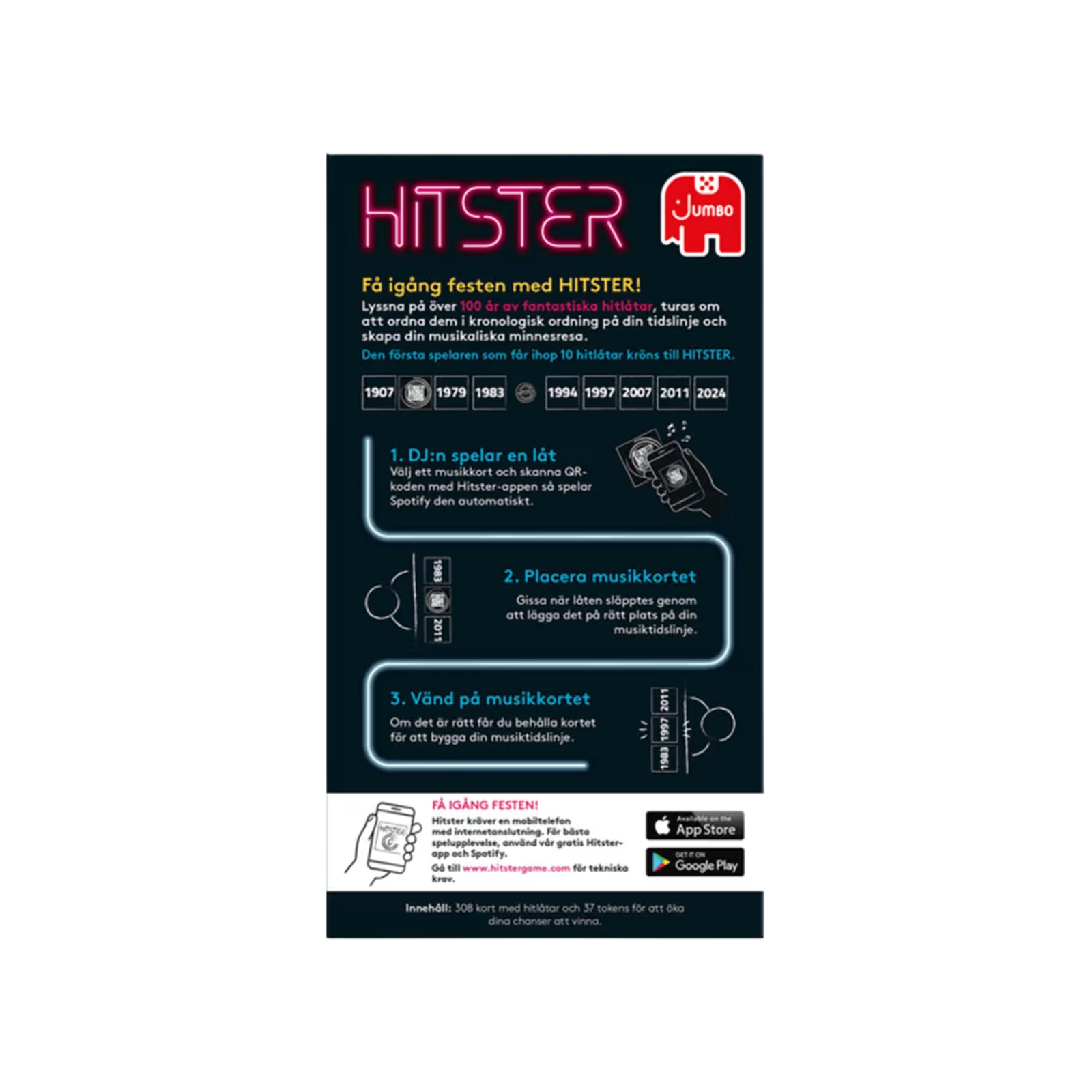 Lyssna på över 100 år av musikhits och turas om att gissa när de släpptes. Du behöver inte veta det exakta året, bara om de släpptes före eller efter andra låtar. Dina chanser att vinna ökar om du också kan nämna artisterna och låttitlarna. Den första spelaren som får 10 träffar i kronologisk ordning vinner spelet och får titeln HITSTER. Lycka till!