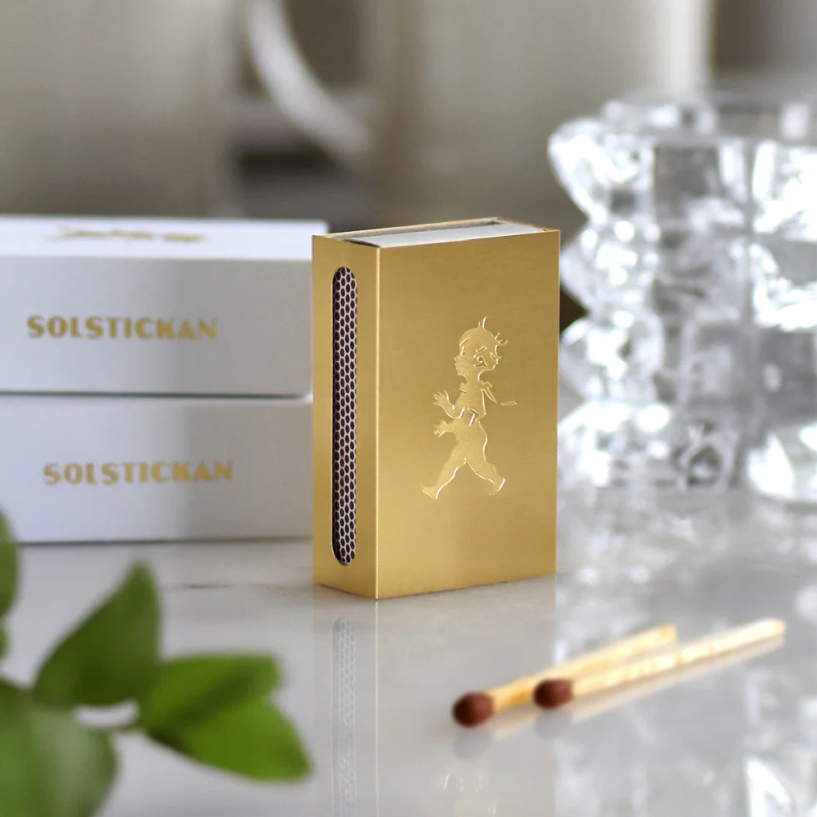 Solstickans tändsticksfodral i silver eller elegant mässing är designad för de mindre tändsticksaskarna. Perfekta i handen, vackra på bordet.