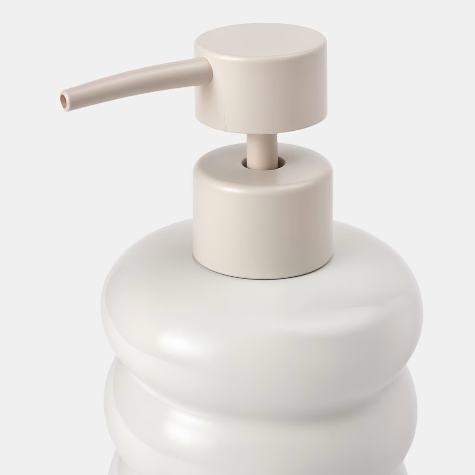 Tvålpump i glaserat stengods och pumpdel i färgmatchad ABS-plast.