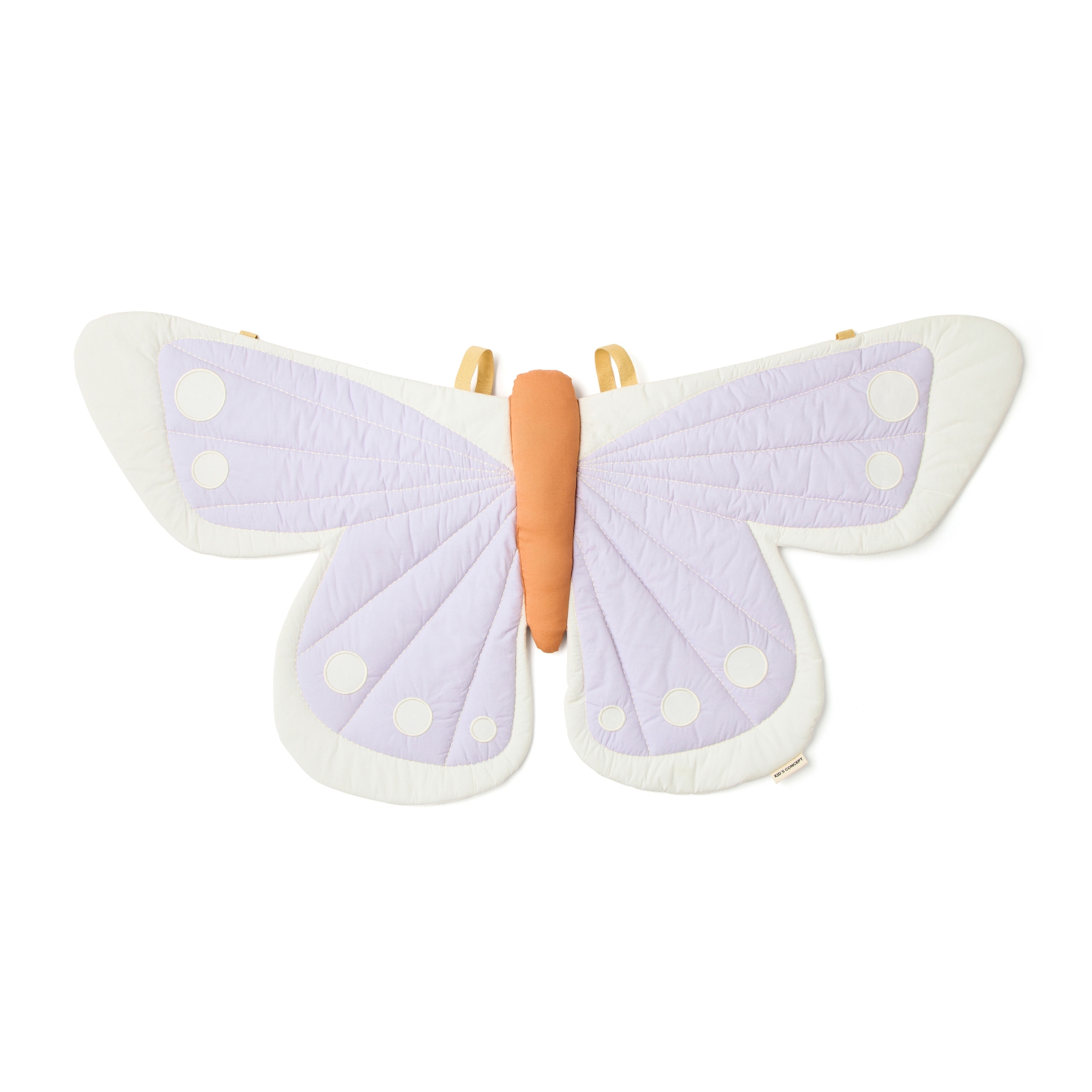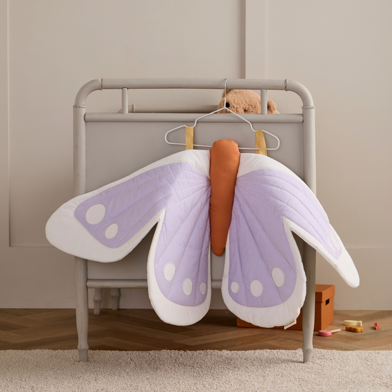 Vingarna är en finstämd blandning av vitt och mjukt lavendel med en mjukbrun kropp i mitten, och lätt vadderade för att hålla formen. Broderade detaljer ger extra textur och en elegant känsla.