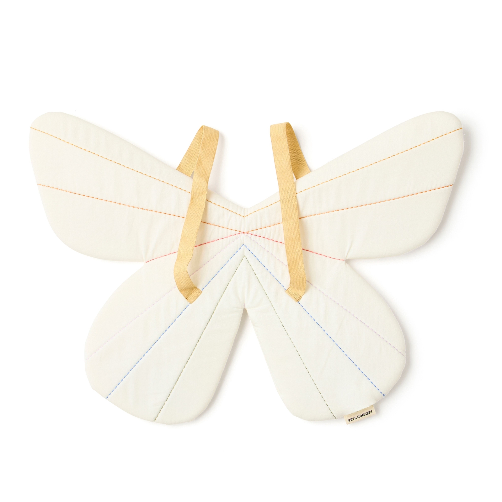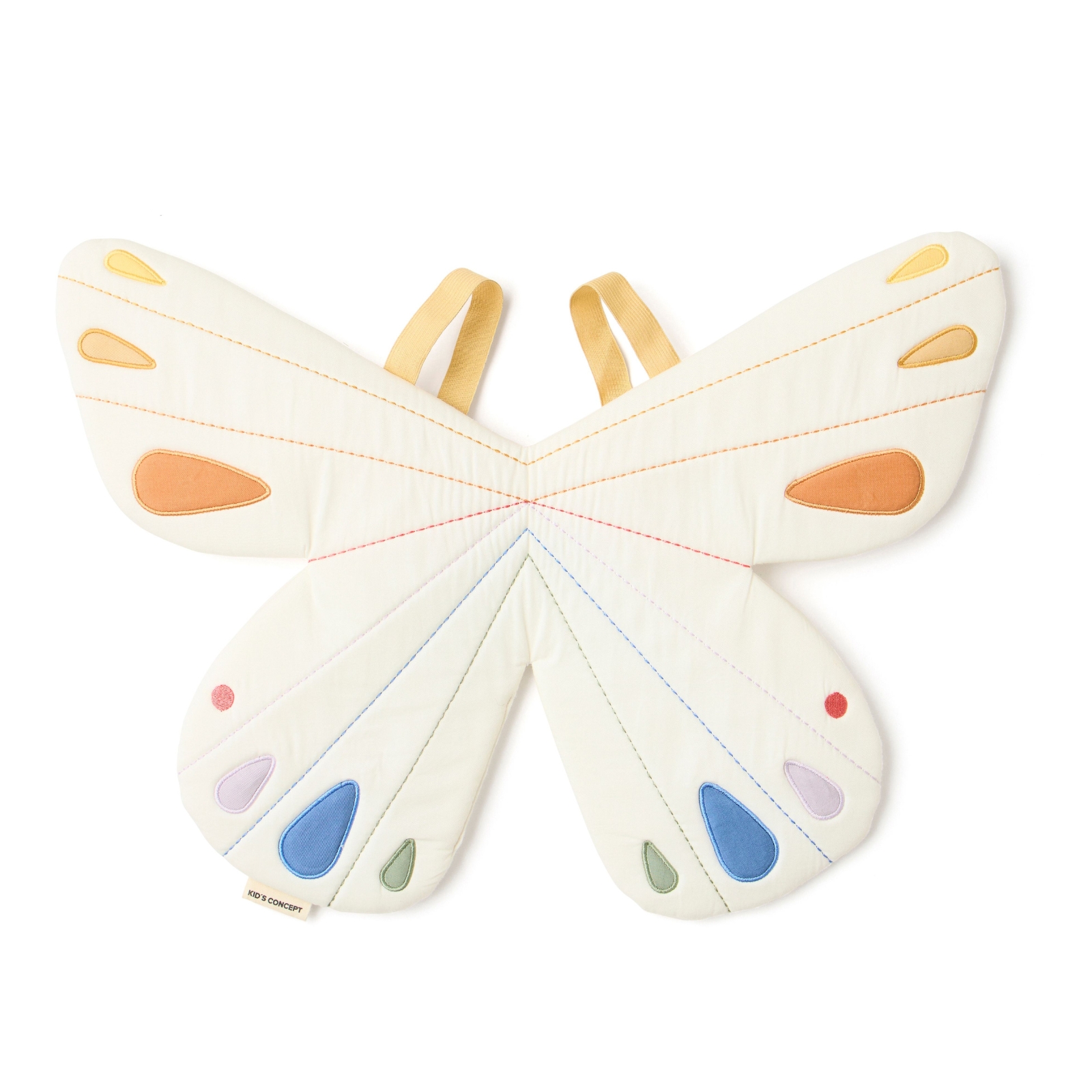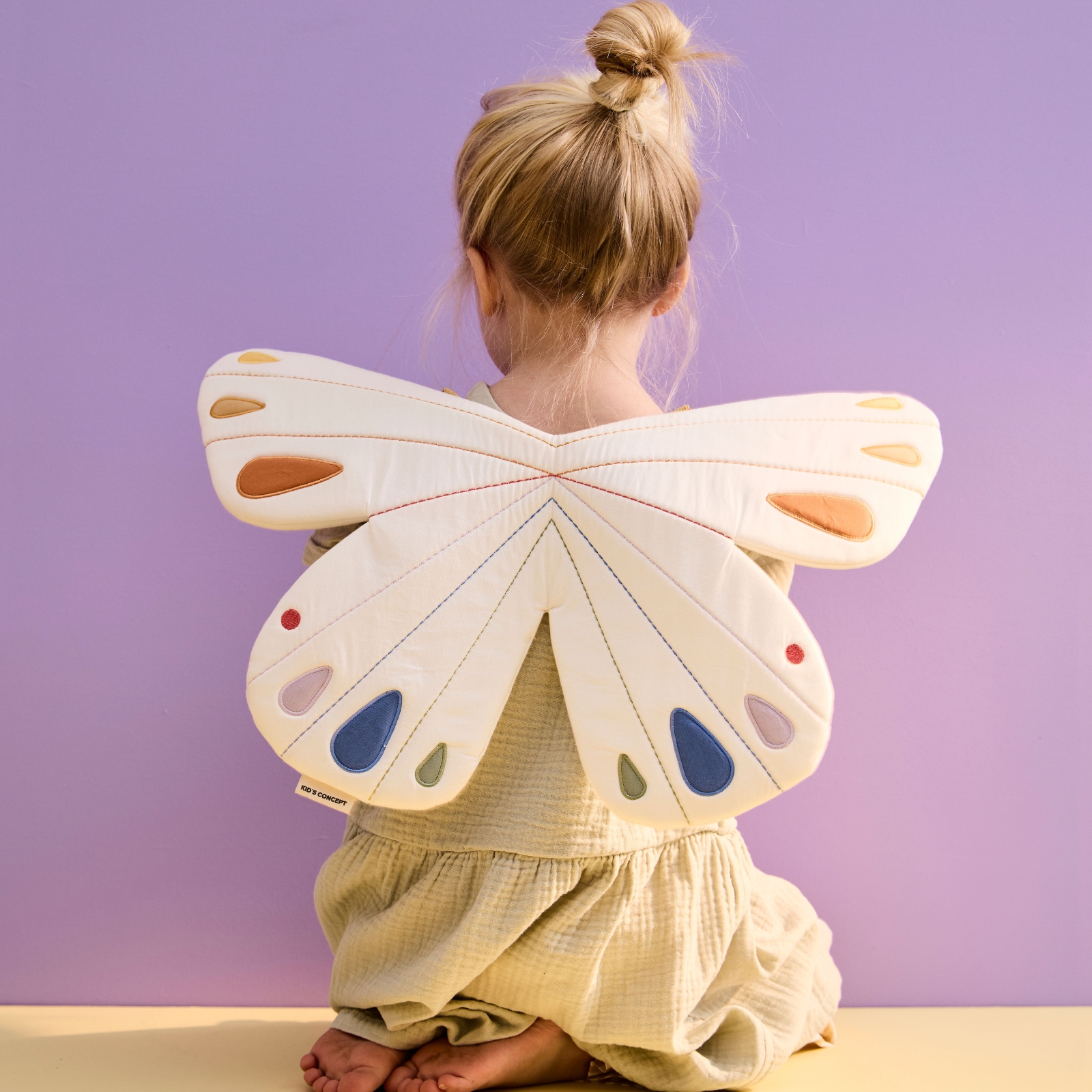 "Fjärlien svävar på mjuka vindar, dess ömtåliga vingar målar luften med en lätt rörelse." De här vingarna är designade för att bäras på ryggen med elastiska axelband, vilket gör dem både enkla och bekväma att ta på. Vingarna är vadderade för att behålla sin form under leken, och de broderade detaljerna ger både stadga och textur. Utklädningslek hjälper barn att utforska sin kreativitet och utveckla sina berättarförmågor, och vingar som dessa uppmuntrar till aktiv rörelse när de låtsas "flyga". Den enkla designen gör det lätt för barnen att ta på sig själva, vilket stödjer självständig lek.