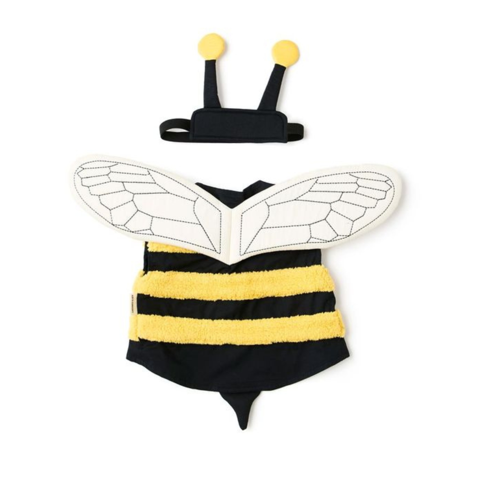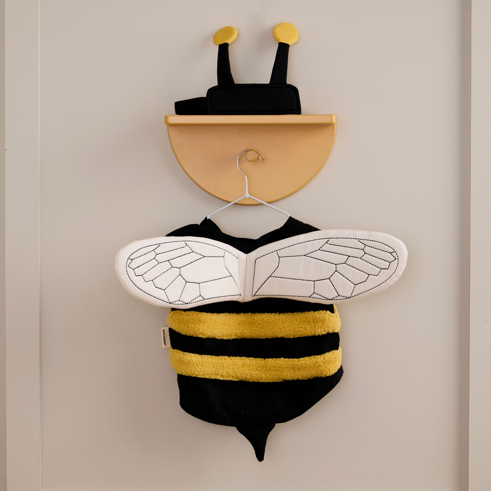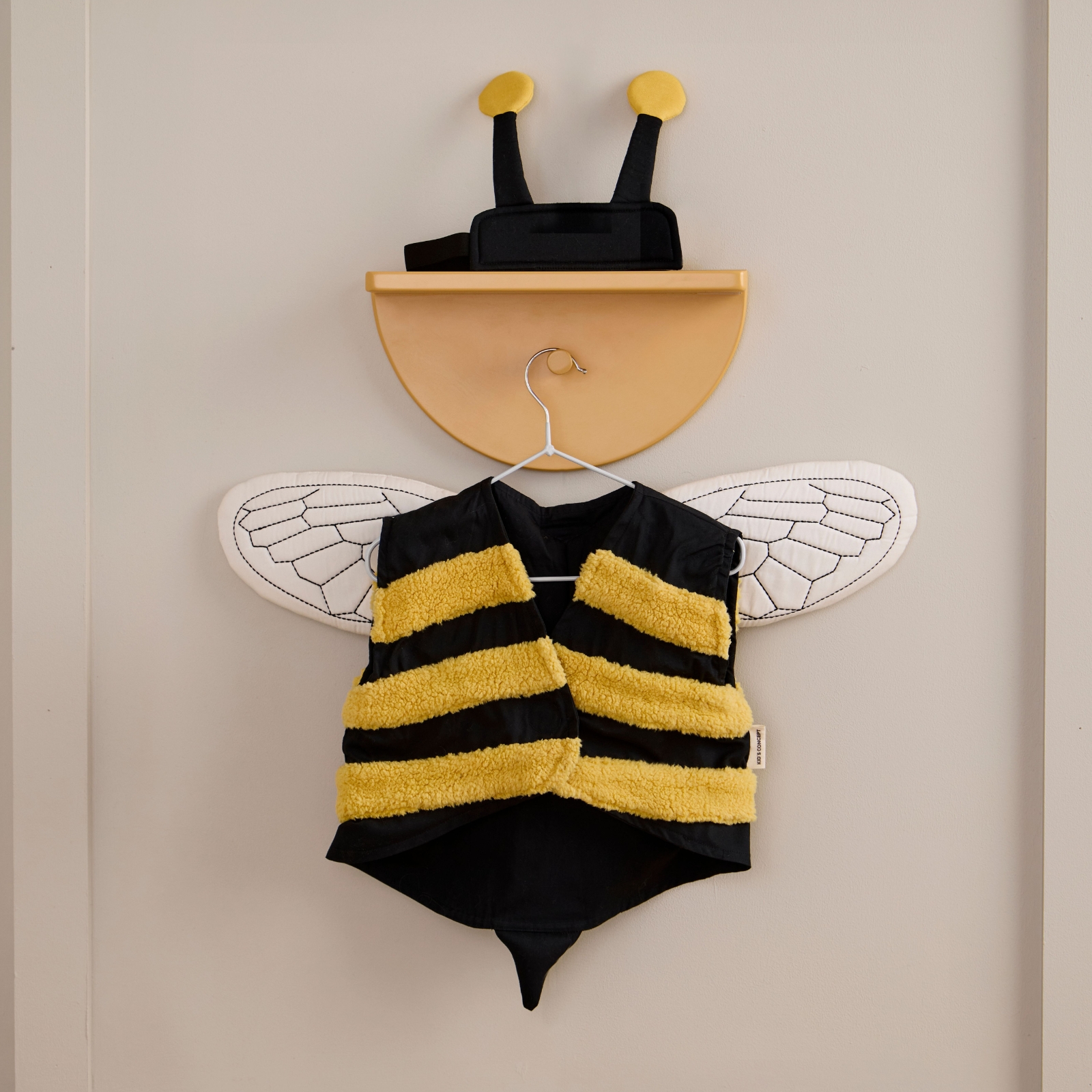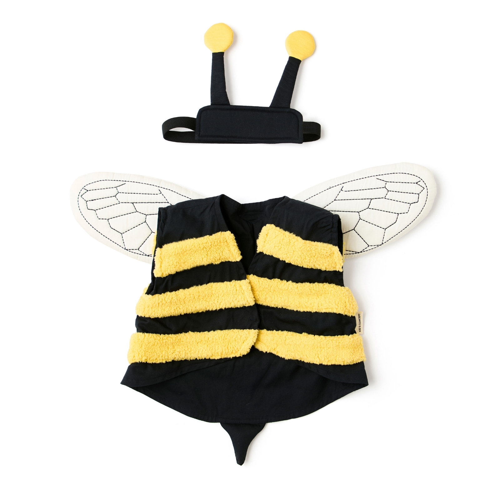 Den här humlekostymen ger barn låtsas vara en liten humla och låtsas att dom flyger omkring i naturen. Västen har gula, mjuka ränder som påminner om humlans päls och har broderade, vadderade vingar på ryggen som ger en fin detalj. Pannbandet med små antenner fulländar kostymen och gör den både enkel och charmig. Både västen och pannbandet stängs med kardborre, vilket gör det lätt för barnen att ta på och av under leken. Barnen kan låtsas flyga mellan blommorna, pollinera eller upptäcka världen som en flitig humla. Den här kostymen erbjuder både komfort och smart design.