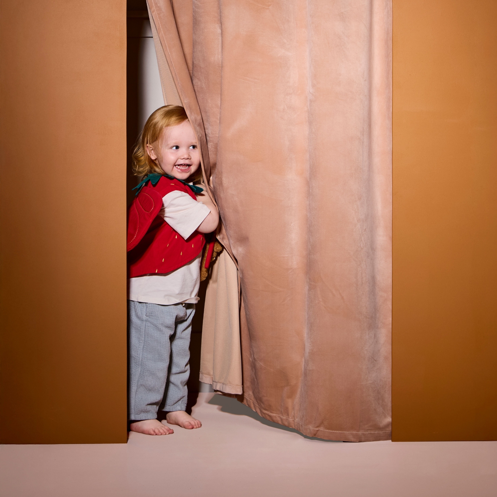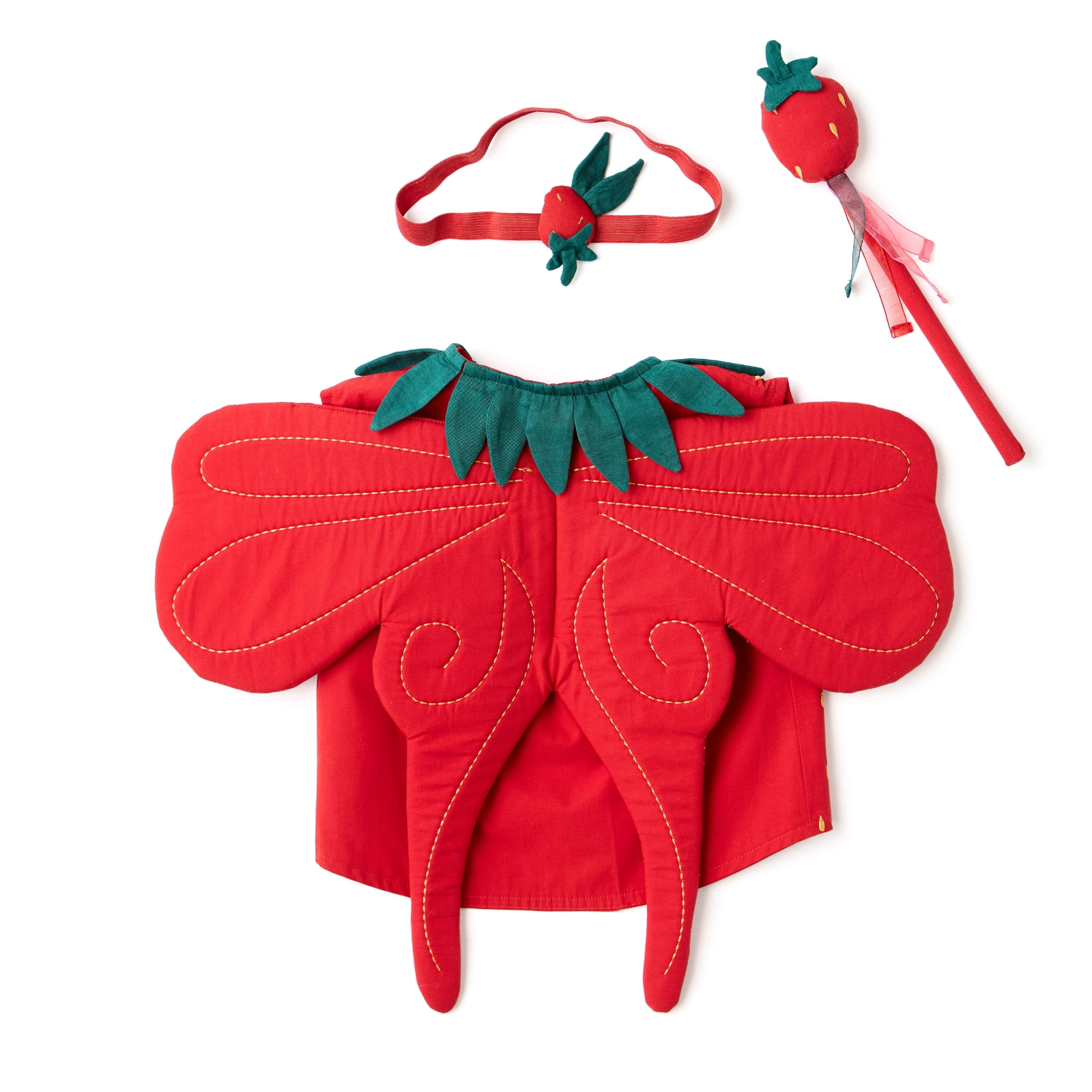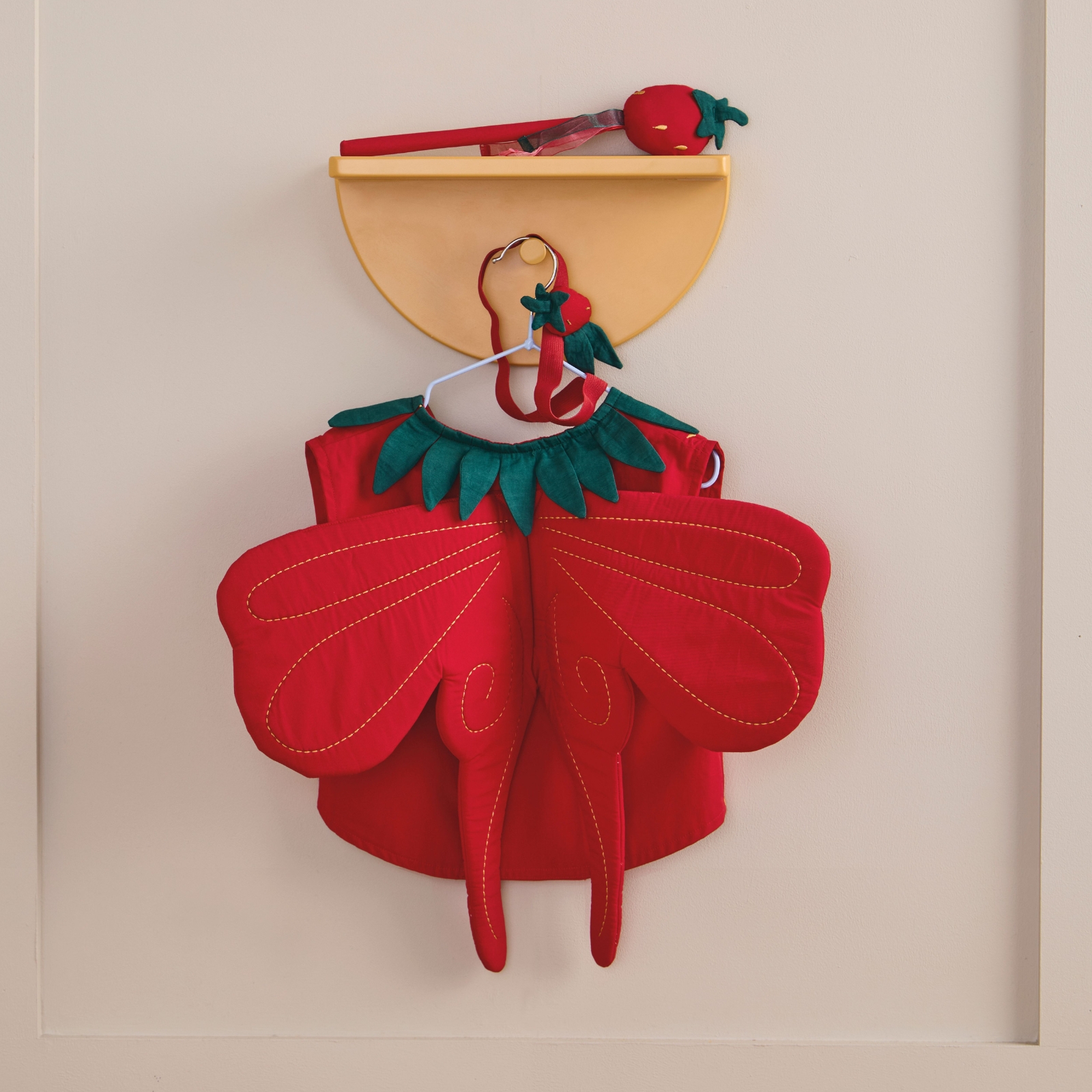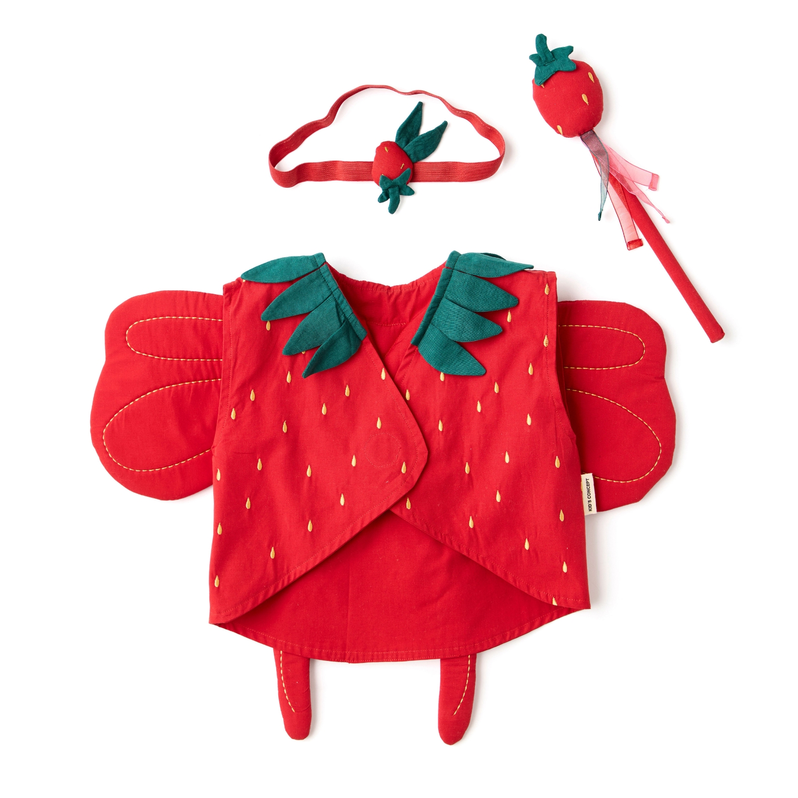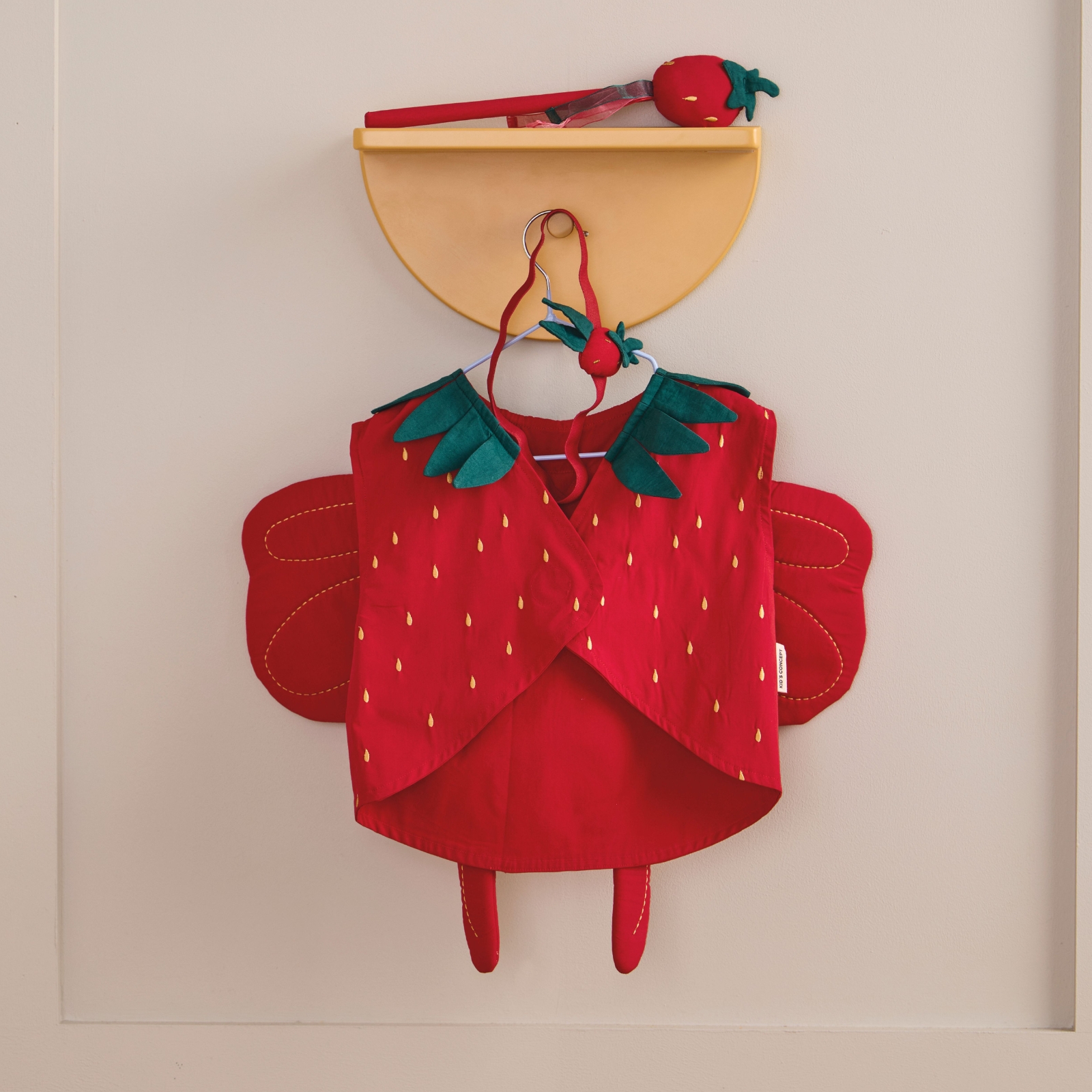Sött, rött och full av fantasi – den här jordgubbskostymen förvandlar vardagen till en lekfull sommarstund. Den röda västen är sydd i certifierad bomull, har en rundad framkant, en krage i form av gröna blad och knäpps enkelt med kardborreband. På ryggen sitter små vadderade vingar, och på huvudet ett pannband med en jordgubbe som prydnad. Kostymen kommer också med en matchande trollstav – redo att förvandla bord, leksaker eller hela trädgårdar till en värld full av jordgubbar.