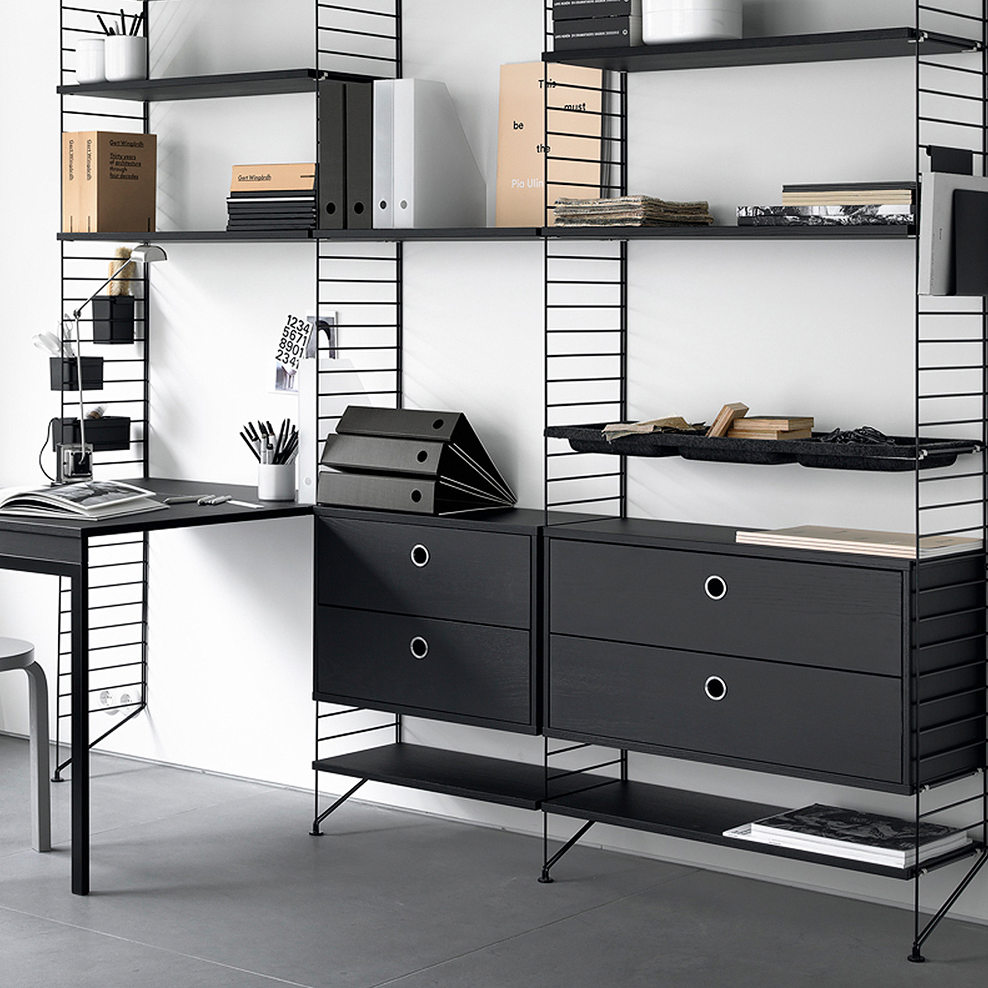 Stringhyllan ritades redan 1949 av arkitekten Nisse Strinning och har tack vare sin smarta konstruktion blivit en tidlös designklassiker. Med den flexibla pockethyllan får du en kompakt och stilren lösning för mindre utrymmen, medan det modulära hyll-systemet kan byggas ut, kombineras och anpassas efter behov och smak. Genom ritverktyget går det enkelt att planera och visualisera sin egen String-lösning, välj färg, material och mått för att skapa en personlig kombination som passar alla rum. String Furniture står för funktionell, hållbar och stilren design med produktion i Sverige sedan mitten av 1900-talet.