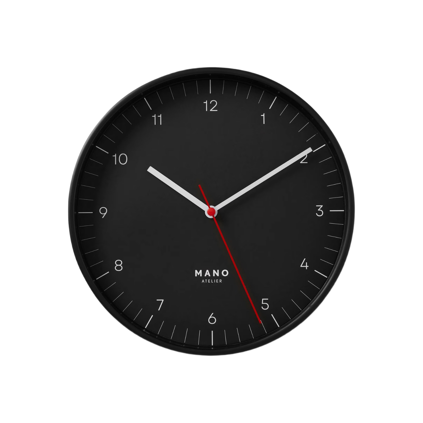 Minimalistisk väggklocka i svart med tim- och minutvisare i vitt och sekundvisare i rött.