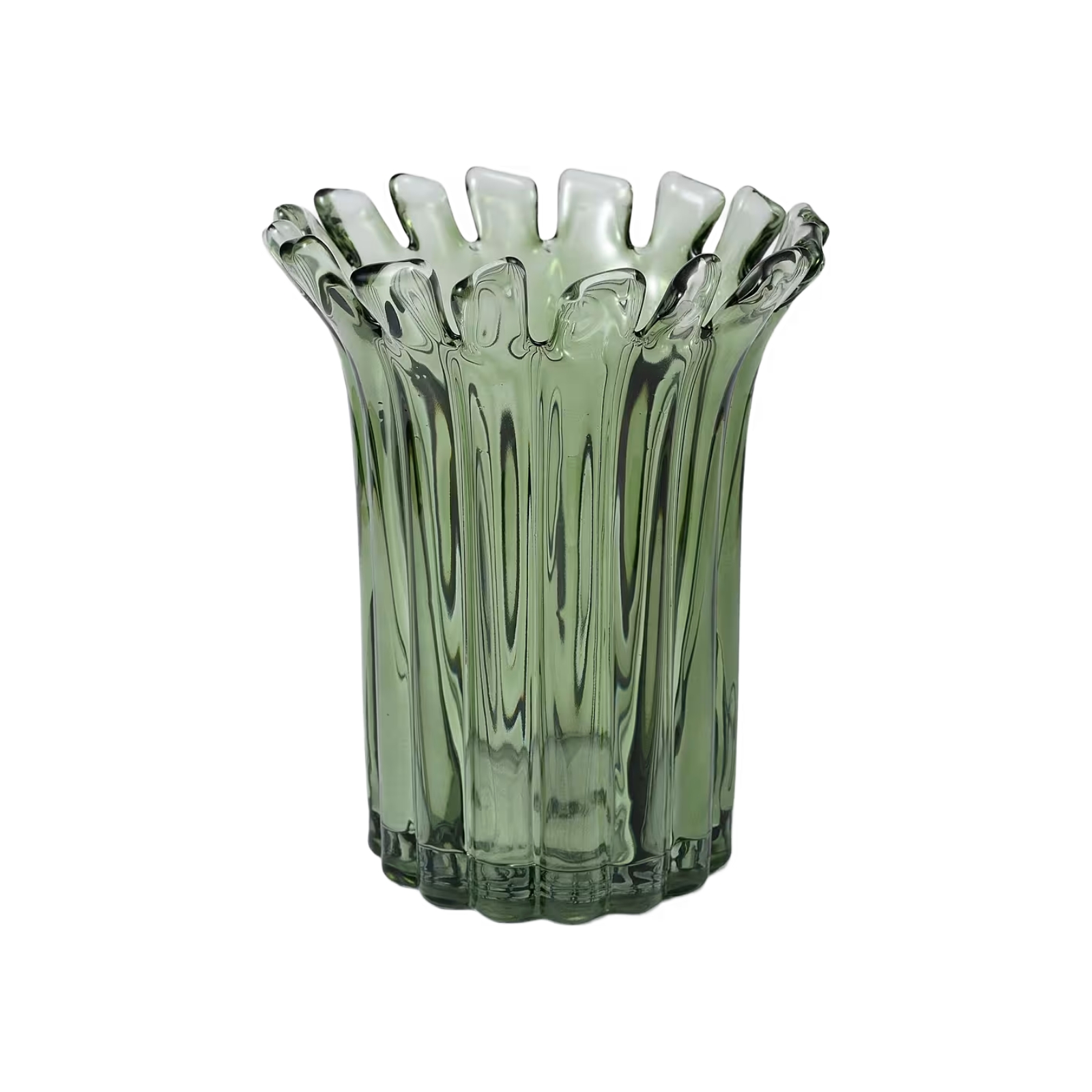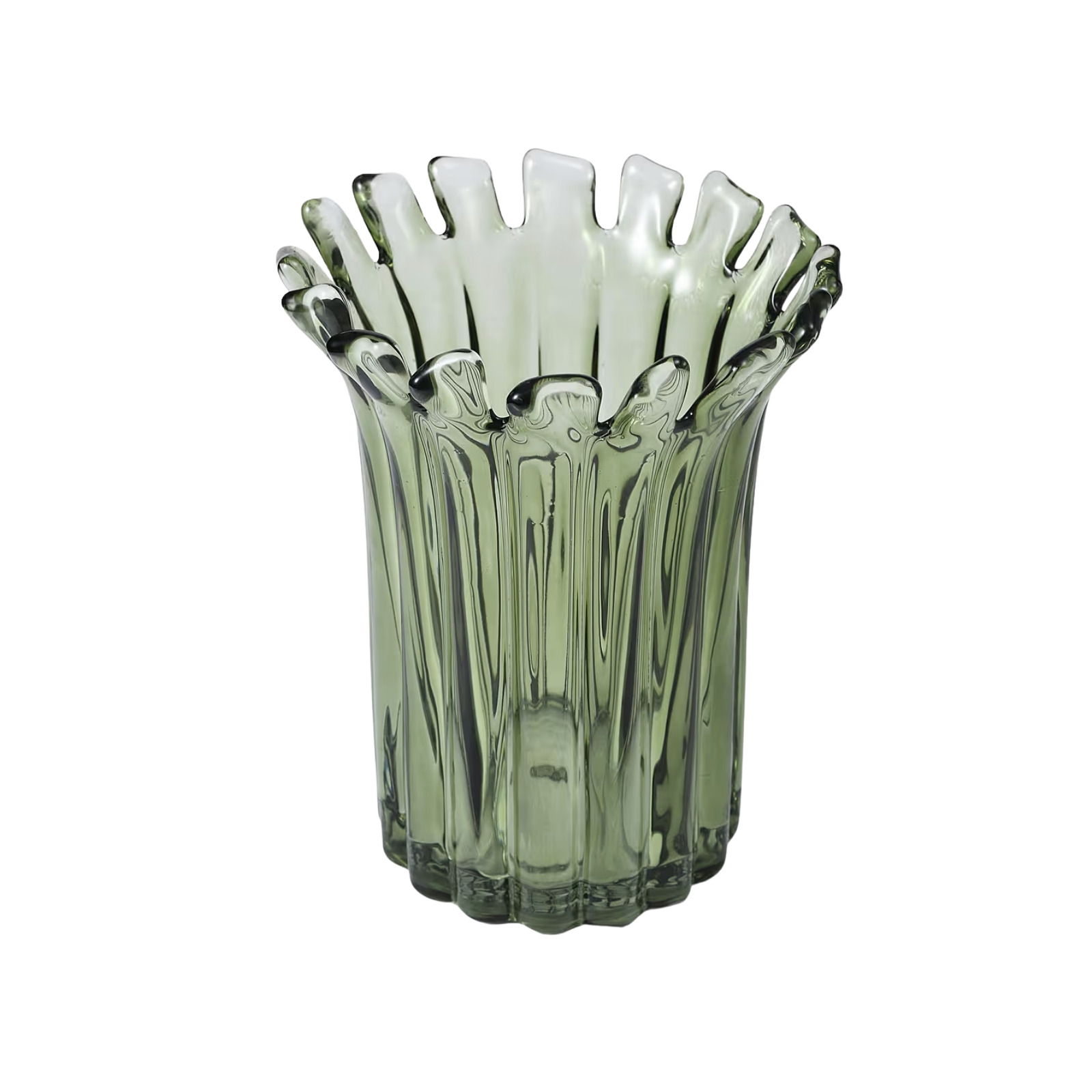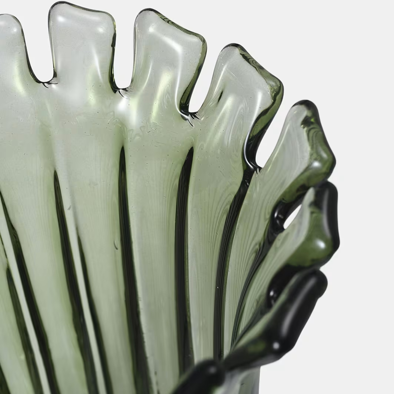 Handgjord glasvas med ett elegant mönster och taggig toppkant.