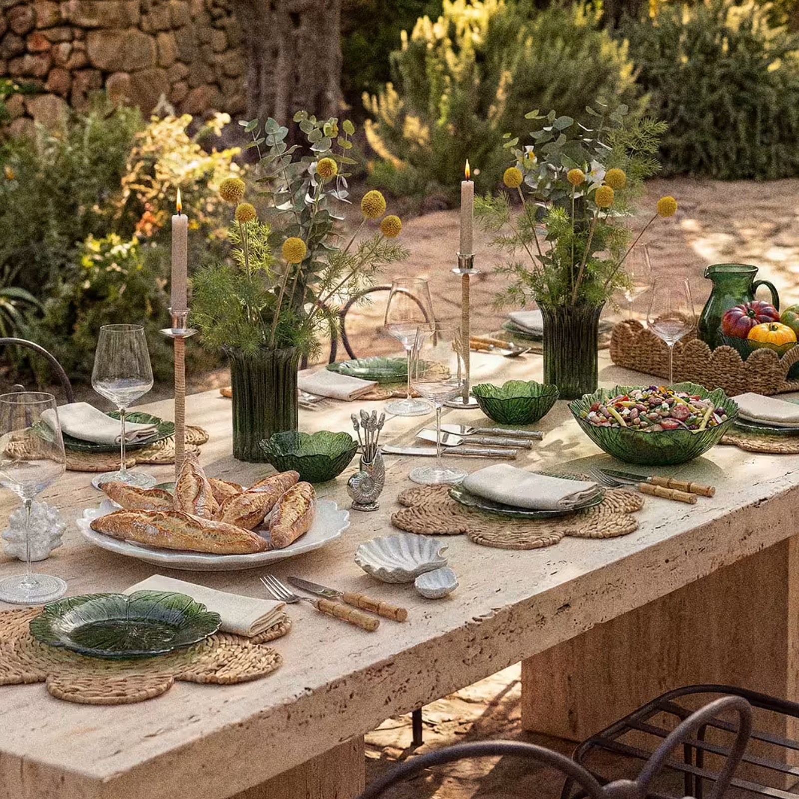 Skapa din egen unika dukning. Med vackert målad keramik i oräkneliga kombinationer, tunna glas och textiler med lekfulla detaljer – som volanger, klassiska ränder och broderade kanter. En kreativ färginjektion, som för tankarna till stora middagar i skuggan under citronträden.
