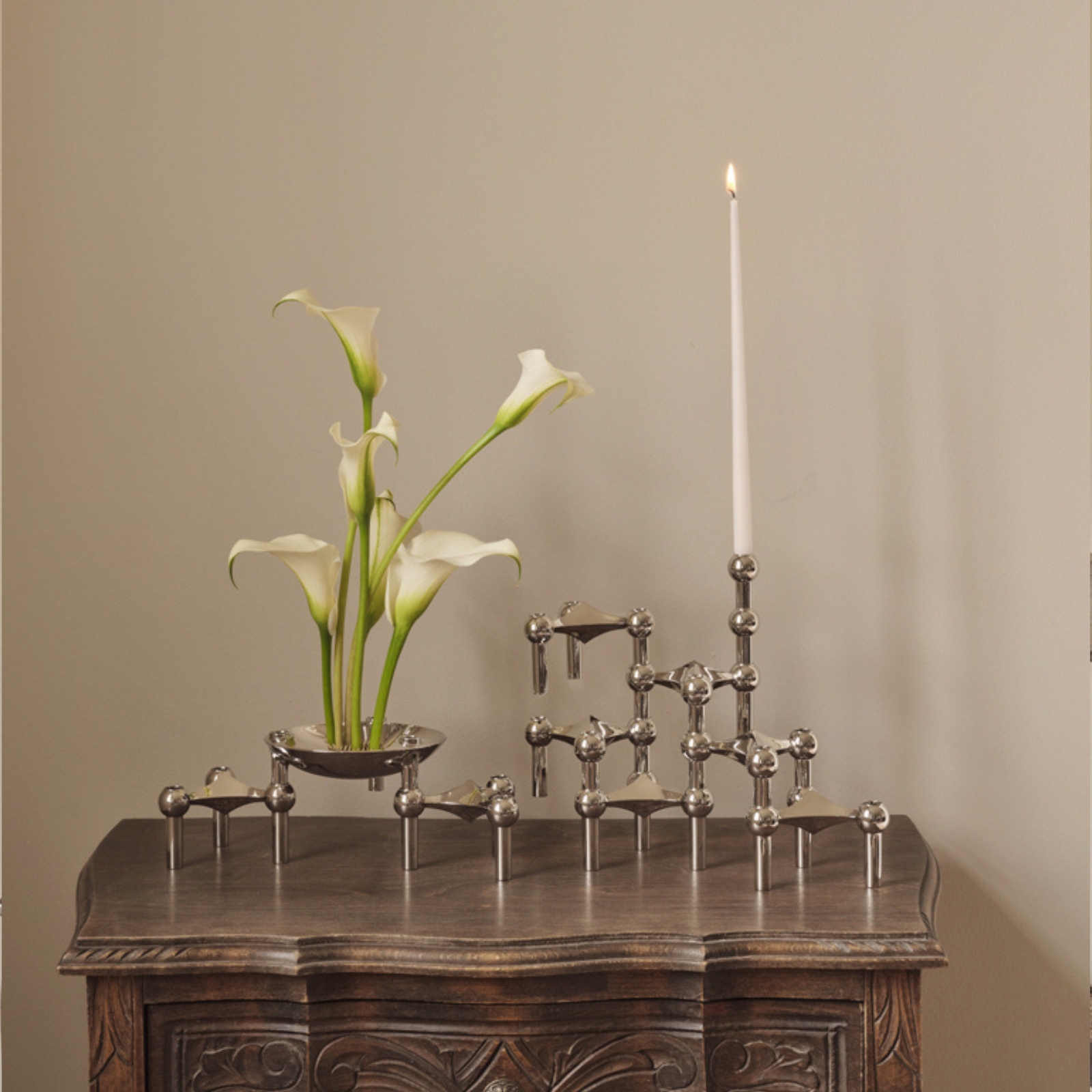 Den är formgiven som en naturlig förlängning av STOFF Nagels karakteristiska uttryck och kan kombineras med både ljusstakarna, skålen och stället. Vasen tillför en extra dimension till den klassiska designen och gör det möjligt att addera en färgstark blomdekoration till din skulptur.