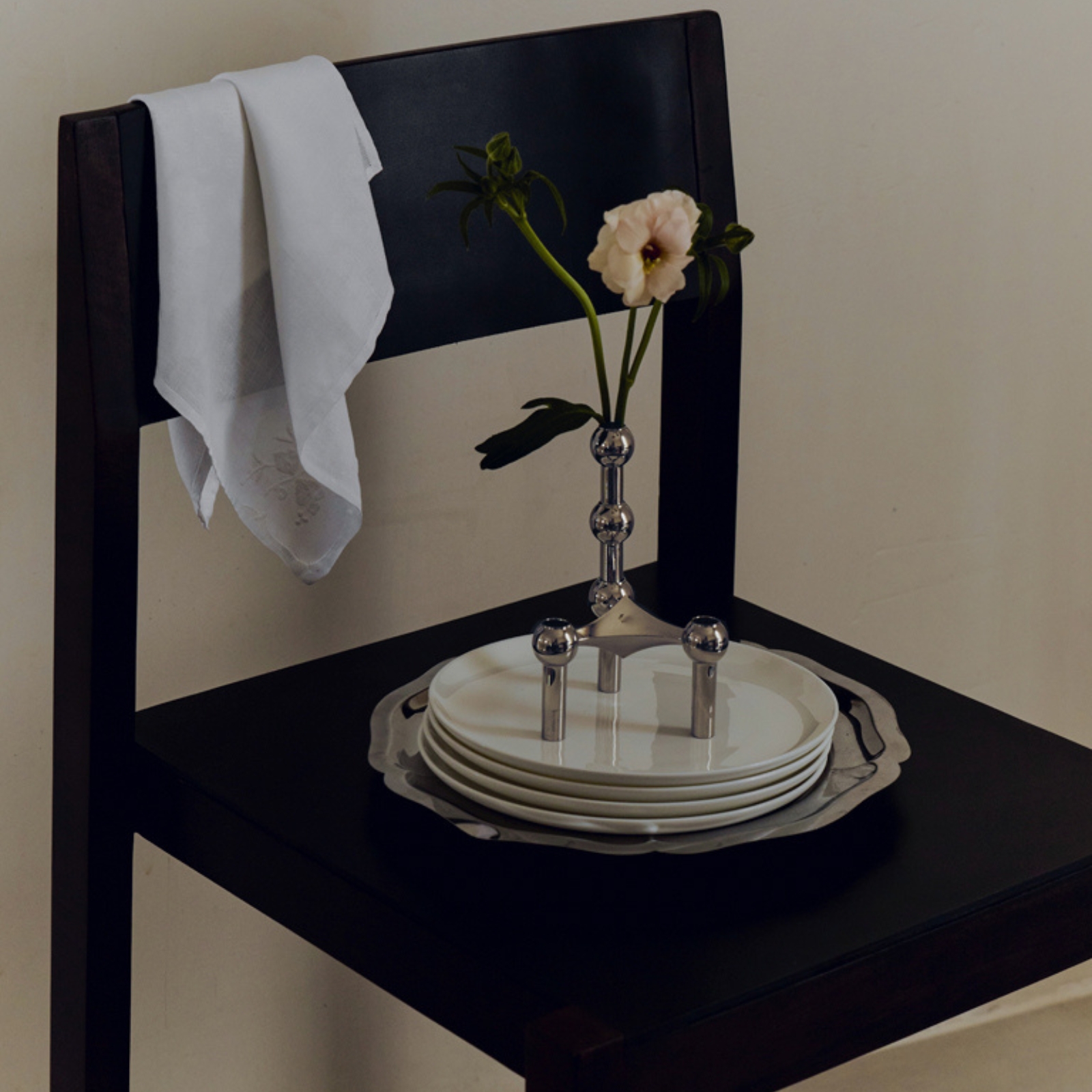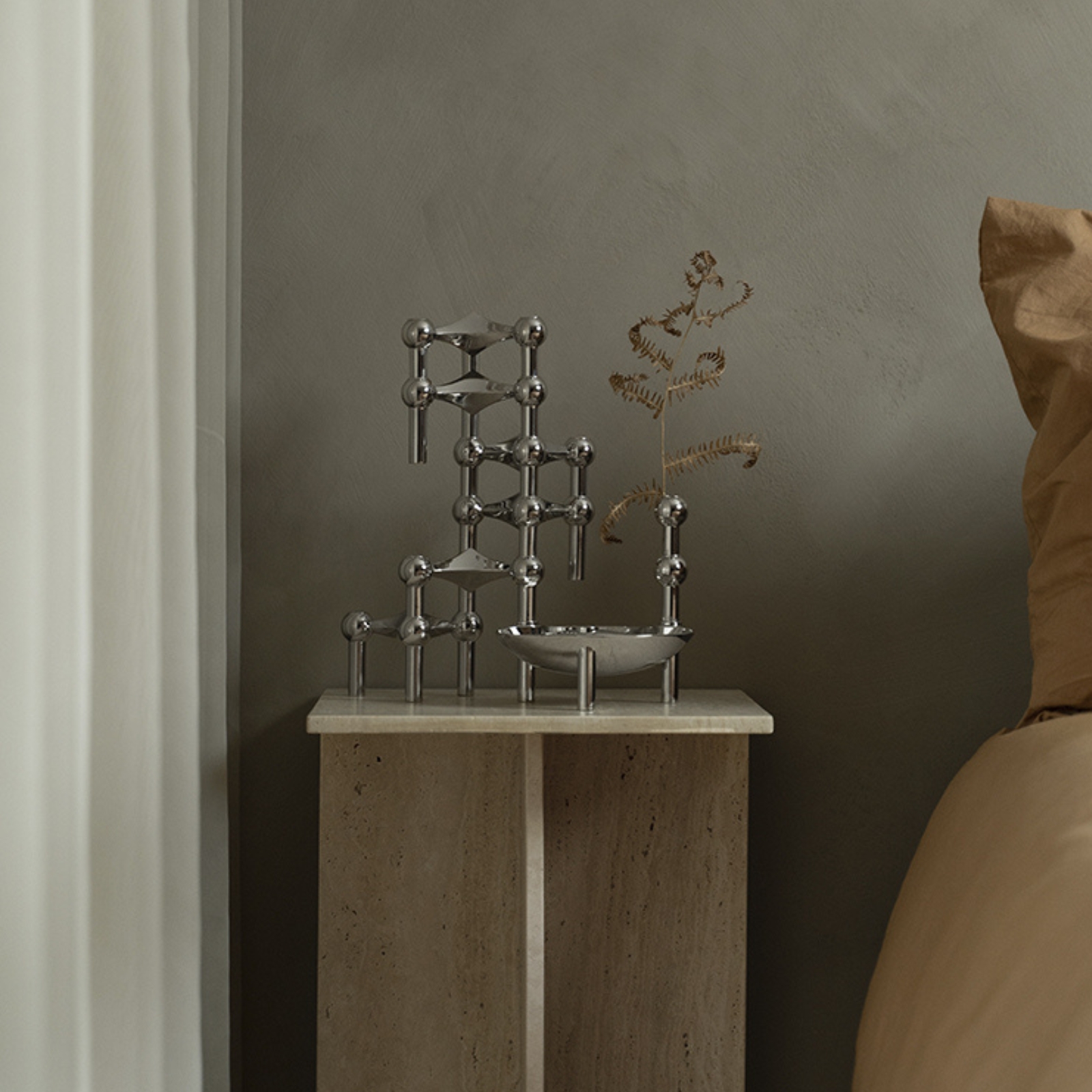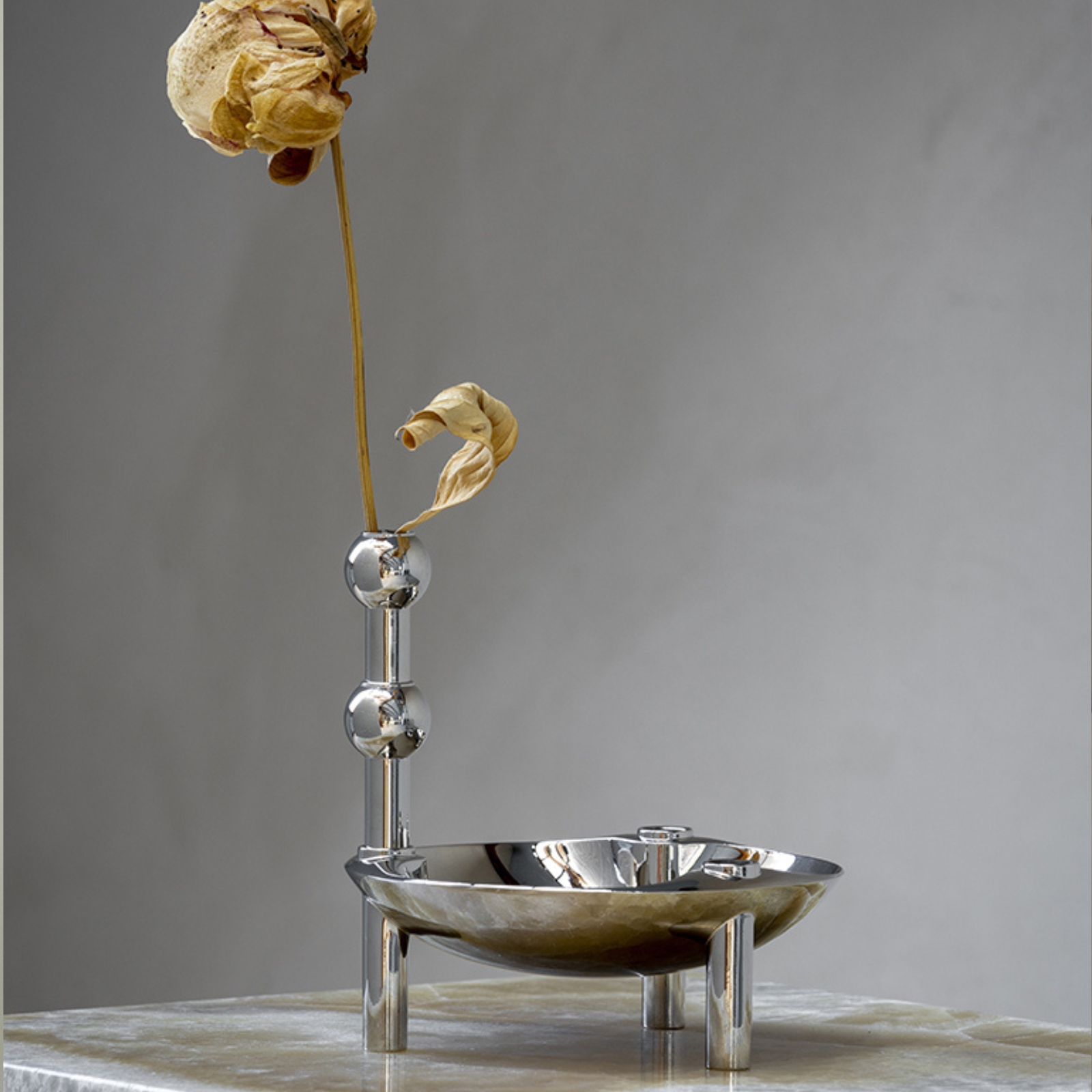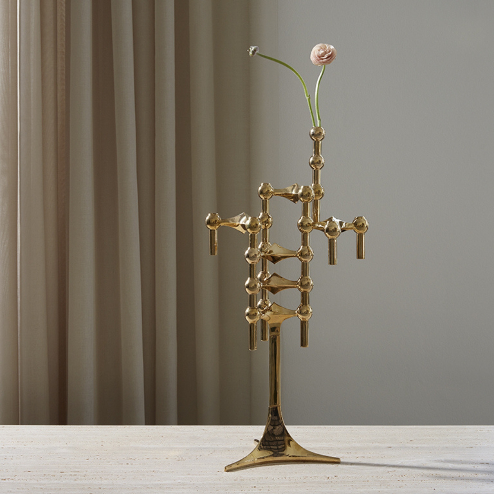 Den är formgiven som en naturlig förlängning av STOFF Nagels karakteristiska uttryck och kan kombineras med både ljusstakarna, skålen och stället. Vasen tillför en extra dimension till den klassiska designen och gör det möjligt att addera en färgstark blomdekoration till din skulptur.
