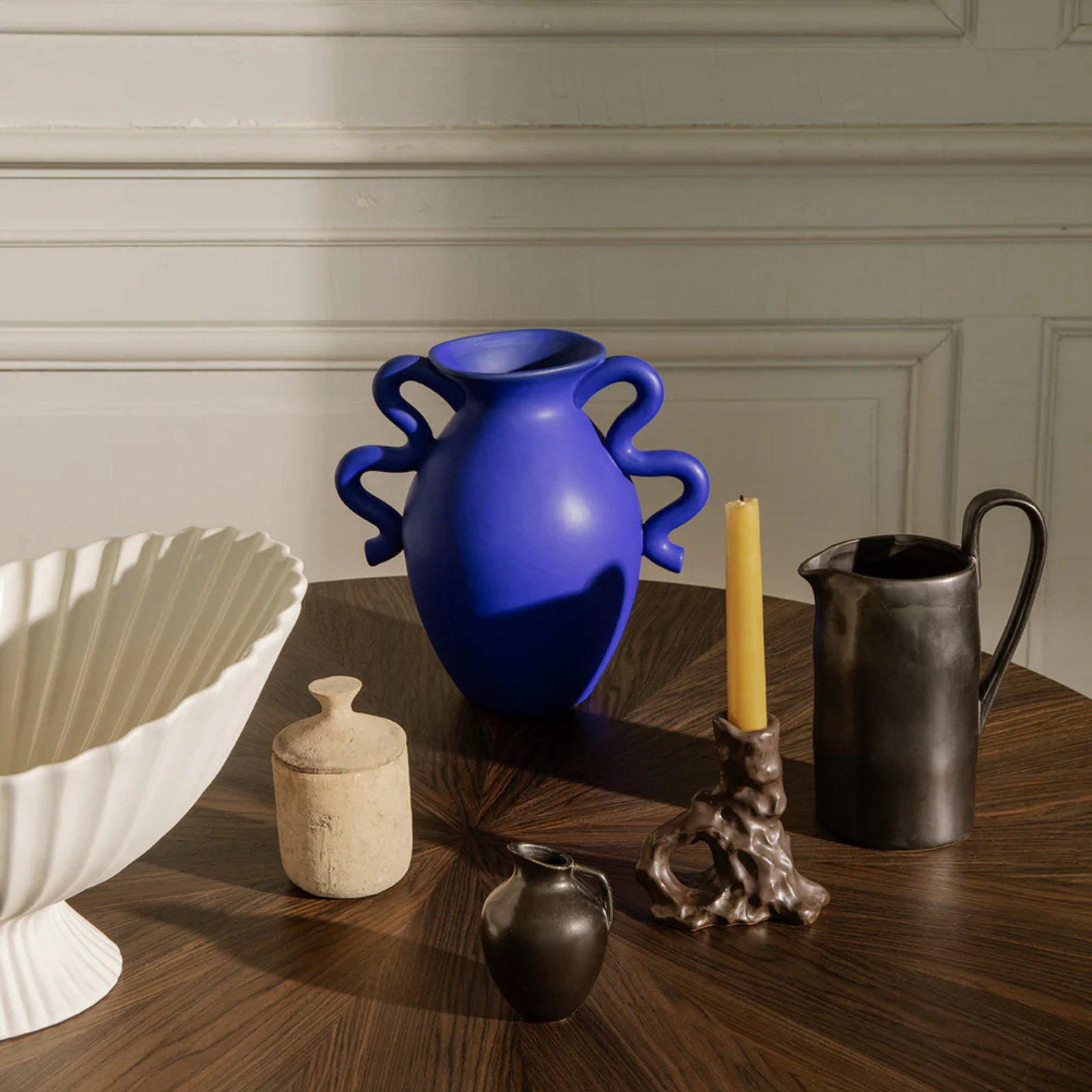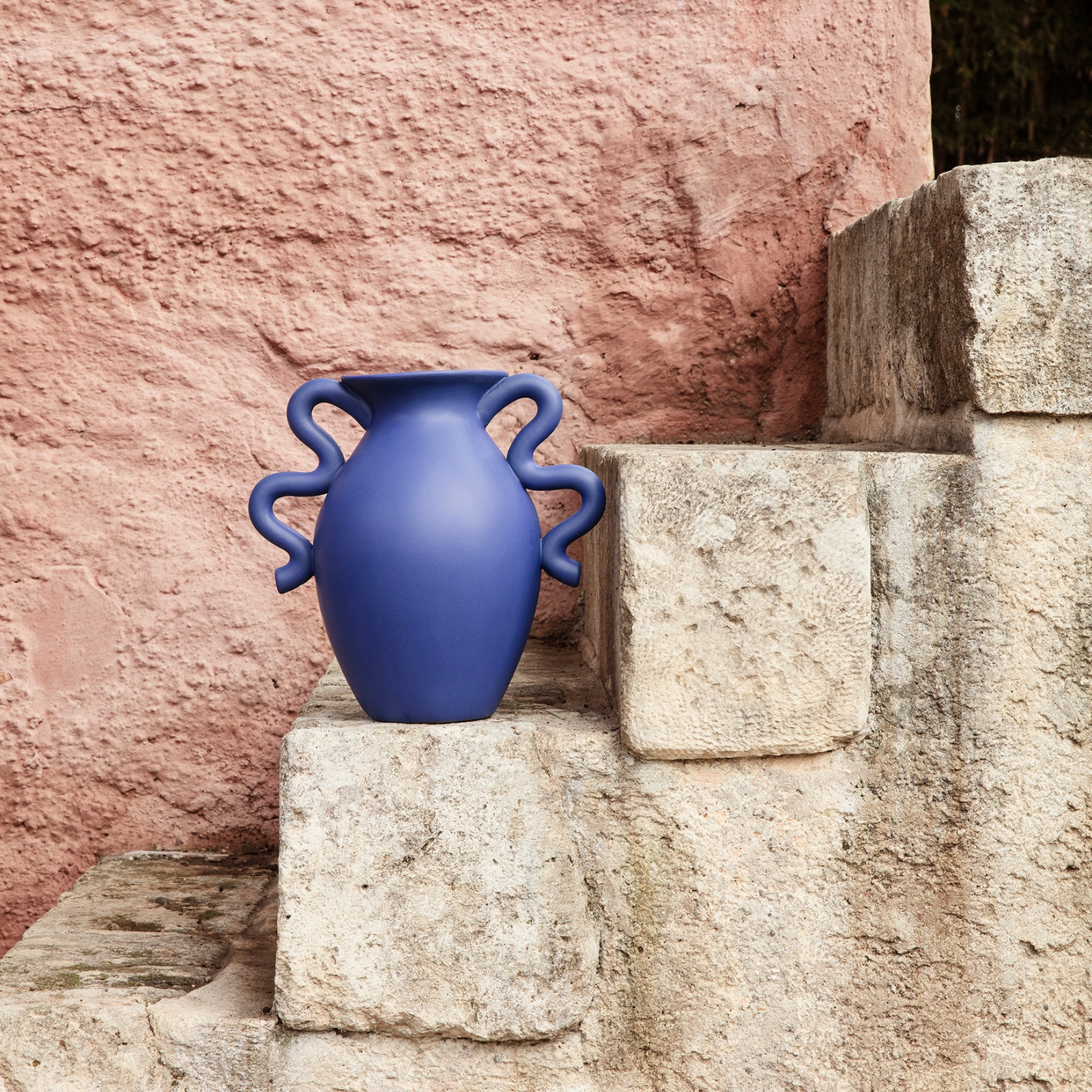 Verso Table Vase hämtar inspiration från klassiska keramikformer, men tolkar dem på ett nytt och charmigt sätt. Den mjukt oregelbundna siluetten och de två vackert böjda handtagen ger vasen en feminin och modern karaktär, samtidigt som uttrycket känns tidlöst och välbekant.